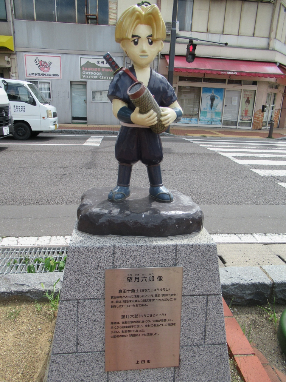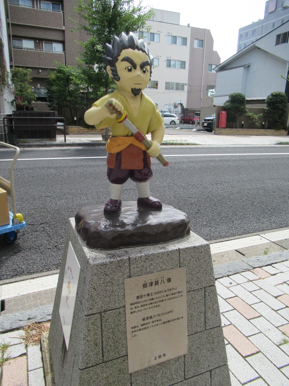 上田駅から柳町までの範囲に道路沿いに可愛らしい真田十勇士像があります。上田城跡公園から大手通りの両側に設置されている勇ましい真田十勇士のパネルと比べると、親しみやすいモニュメントです。2013年に子どもが見たり触ったりすることができる大きさで造られました。暑い日に上田城跡公園から市内を散策し、疲れた時にこのモニュメントを見ると和み頑張って歩こうと励みにもなりました。前回上田散策した時は、設置されてから年数が経ってなくて色鮮やかでしたが、今回は少し色あせていて年月を感じました。