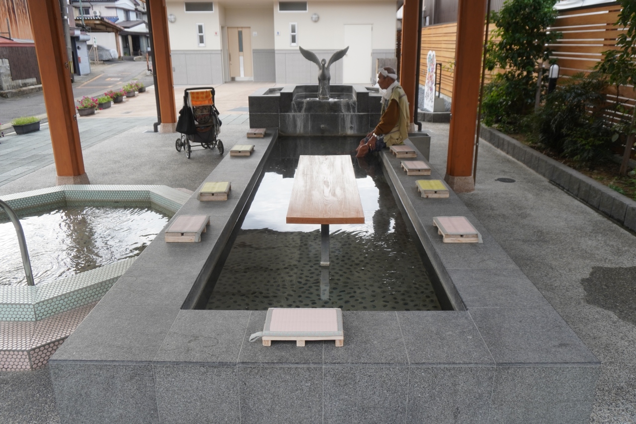 湯っつら広場は、嬉野温泉のメインストリート沿い。立派な構えの足湯があって、夜も朝も誰かしらかが利用しているような人気の場所。湯の口には神功皇后により嬉野温泉が発見された伝説に因んで白鶴のモニュメントが置かれています。