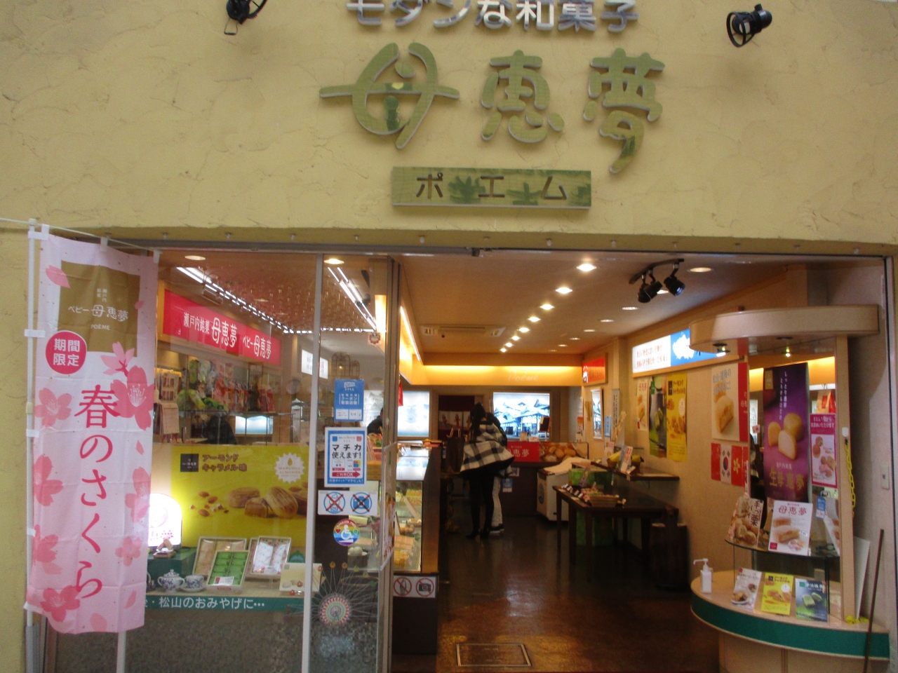 道後温泉の商店街を散策中に立寄りました。店内にベンチがあり、座りながら商品を見ることが出来ました。お菓子はバラ売りもありましたが、3個入りポエムの期間限定品を購入することが出来ました。空港でも購入できますが、市内のお店も覗いてみるといいです。