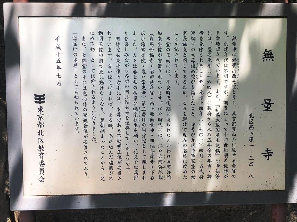 「無量寺」の歴史と概要を紐解いてみると、「無量寺」は、真言宗豊山派の寺院です。「無量寺」の創建年代等は不詳ですが、調査によって寺地からは14世紀頃の板碑が多数確認されており、鎌倉期から室町期にかけての創建ではないかといわれています。そして、「新編武蔵国風土記稿」や寺伝等には、慶安元年(1648年)に江戸幕府から八石五斗余の年貢・課役を免除されたことが記載されているそうです。また、元禄14年(1701年)4月に五代将軍「徳川綱吉」の生母「桂昌院」が参詣したことや寺号が九代将軍「徳川家重」の幼名「長福丸」と同じてあるため、これを避けて現在の寺社名である「無量寺」に改めたことが記されているそうです。「江戸六阿弥陀巡礼」の3番目、「豊島八十八ヶ所霊場59番札所」、「上野王子駒込辺三十三ヶ所観音霊場3番札所」、「足止め不動」として親しまれています。ちなみに、「足止め不動」と呼ばれるに至ったのは、ある晩、忍び込んだ盗賊が不動明王像の前で急に動けなくなり、翌朝捕まったことから「足止め不動」として信仰されるようになったそうです。「大師堂」の中には「恵心」作「の聖観音像」が安置されており、「雷除けの本尊」としても知られています。