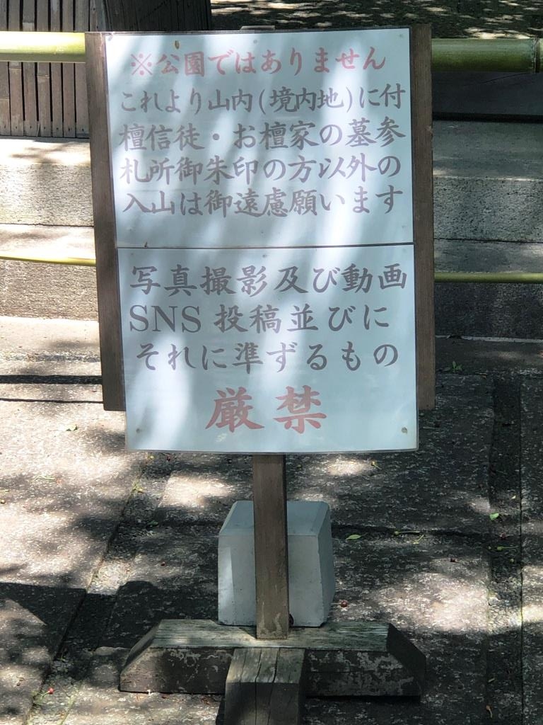 「無量寺」の「山門」の右手には由緒板が設置されていました。そして、少し進むと左手に「ことぶき地蔵尊」があり、その奥に二つ目の「山門」がありました。ここで残念な事実が発覚しました。「山門」の前に柵があり、「これより山内(境内地)に付壇信徒・お檀家の墓参札所御朱印の方位階の入山はご遠慮願います。写真撮影及び動画SNS投稿並びにそれに準ずるもの厳禁」と書かれた看板が設置されていました。残念ながら「無量寺」の境内には入れませんでしたが、正門から山門につづく参道は、道幅も広く、木々が生い茂り、大自然の中にいるような感じでリラックスできました。