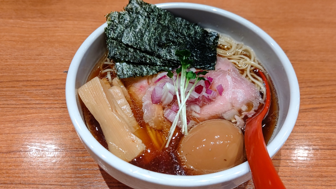 出汁の旨味がありつつもアッサリとした味わいで食べやすく、モッチリとしたストレート麺と、煮卵も美味しかったです。