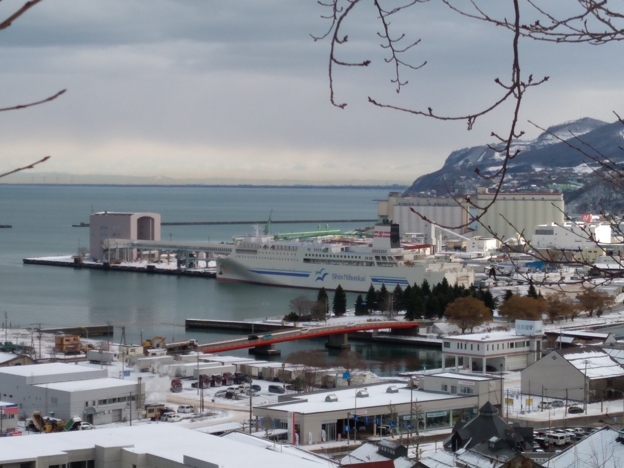 海岸段丘の上なのか?目の前には小樽港を望む丘の上にある神社。内陸側・花園の公園通りを海の方に向かって進み、急坂~階段を進んでいくとある。冬に行ったため、境内一面は銀世界。除雪も最小限と言ったところだったが、歩くことに苦労することはなかった。お参りを済ませた後は港側へ向かう。眼下には小樽港、そして本州とを結ぶ新日本海フェリーの船舶を見る事も出来た。