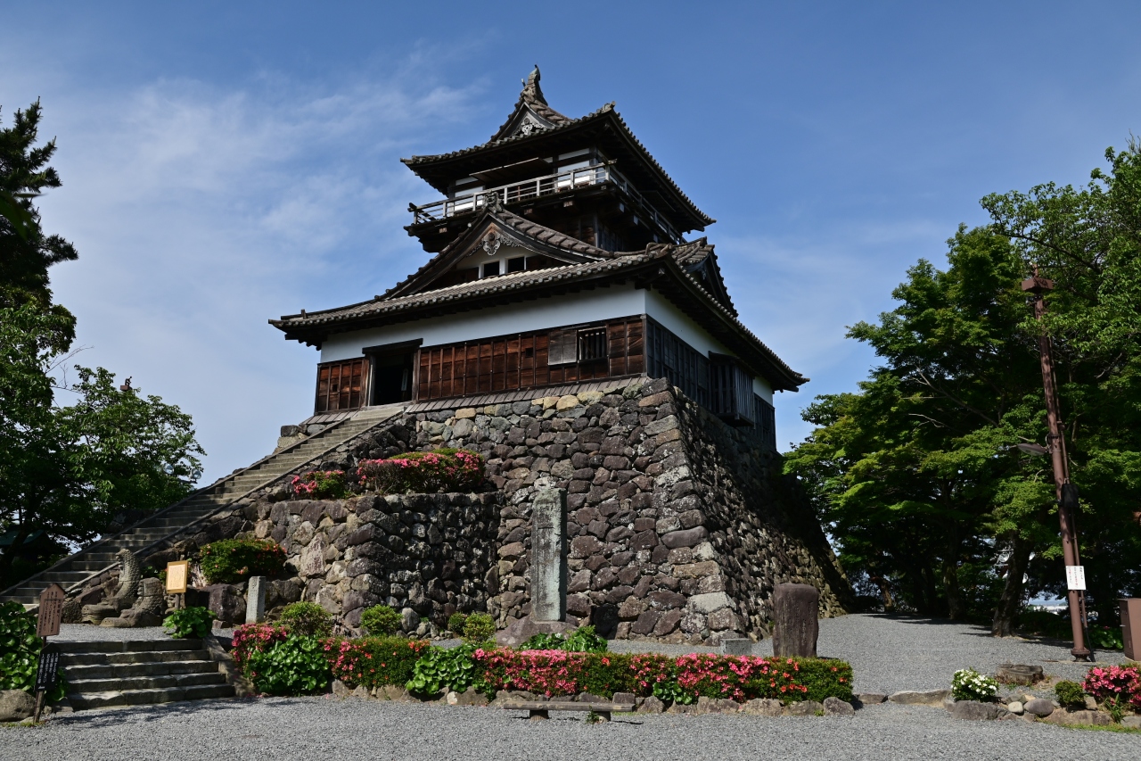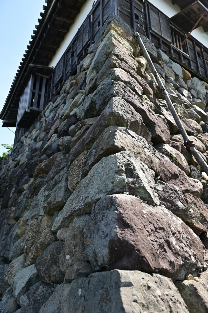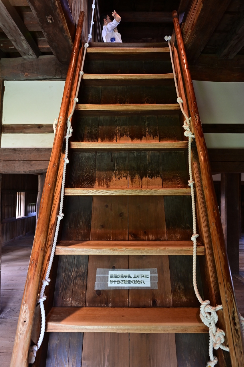 1948(昭和23)年の福井地震で倒壊したが、1955(昭和30)年に修復された。石垣も含めて完全倒壊したが、天守閣の材料や石垣といった主要な材料の多くは再利用できたというから<奇跡>の城だ。天守はそう大きくないが、現存十二天守の中で最も古い様式を色濃く残しているという。それだけ武骨な、戦闘的な意匠と言える。特徴は急勾配な入口と内部の階段だ。特に二階、三階に上がる階段は階段という代物ではなくほとんどはしごだ。同じタイミングで入城した老婦人は、階段の前で上がるのをあきらめていたほどだ。敵の侵略を食い止めるためかもしれないが、敵がここまで攻め入っては万事休すだと思うのだが。丸岡城の天守、おそらくは後年の威容を誇る天守閣というよりも、高い所から戦況を見渡わたす砦の高見櫓のような存在だったかもしれない。