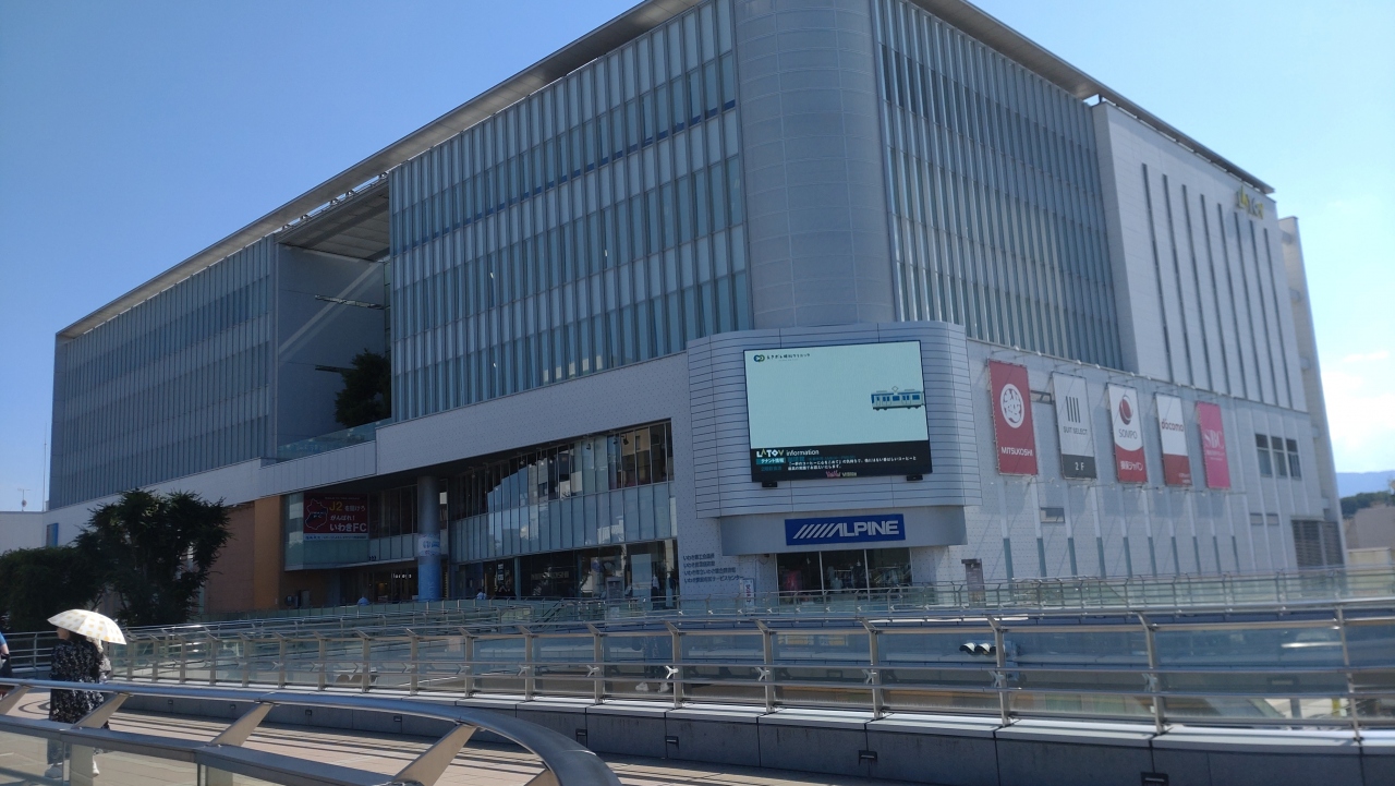 駅からすぐのショッピングモールですが、図書館や公共の施設も入っています。三越やレストラン、カフェ、洋品店、一階には土産物店やケーキショップ、酒屋、寿司店、スーパーもあり便利です。地元サッカーファンが応援時に使うコーナーもありました。