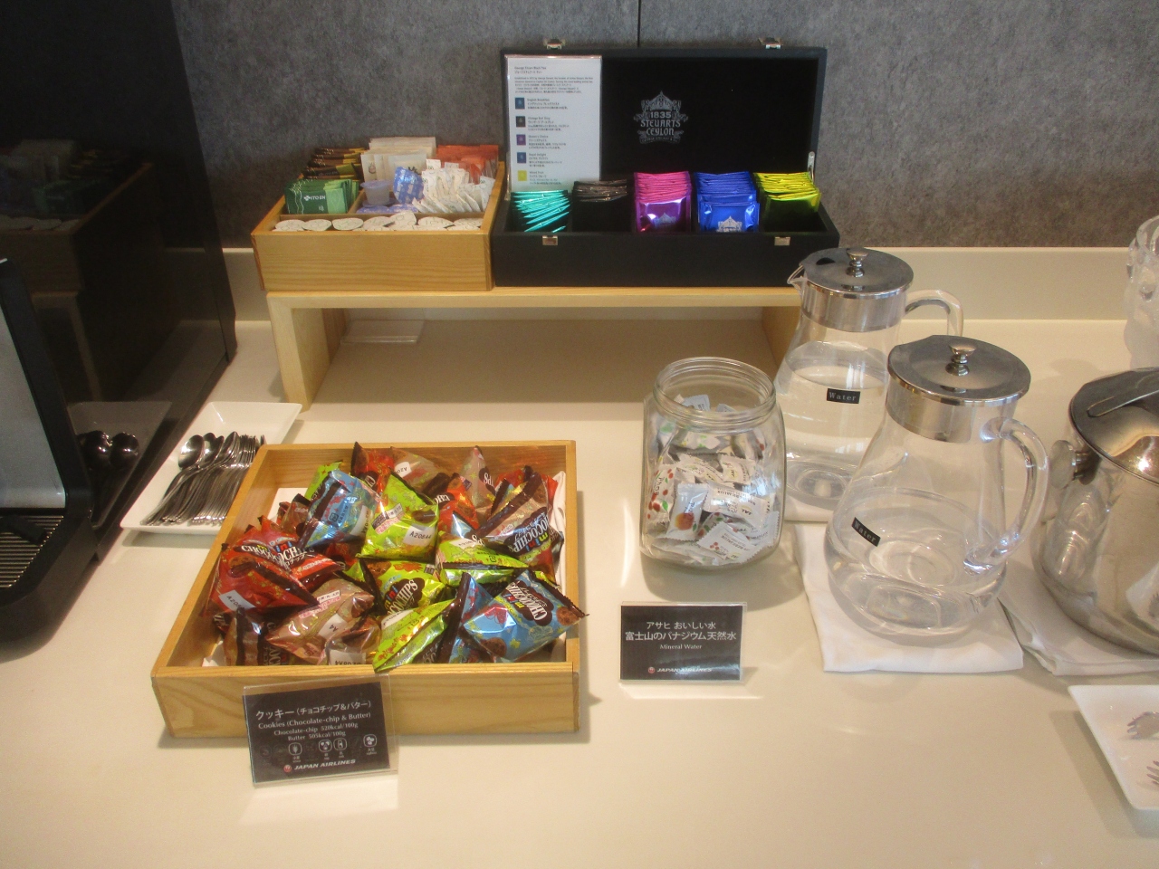 羽田空港国際線 JALサクララウンジにはスナック菓子がありました。三角のかわいい形をしたチョコチップが入ったクッキーです。色違いではありますが、中身は同じでした。甘いものとウィスキー、バーボンの組合わせもおいしかったです。