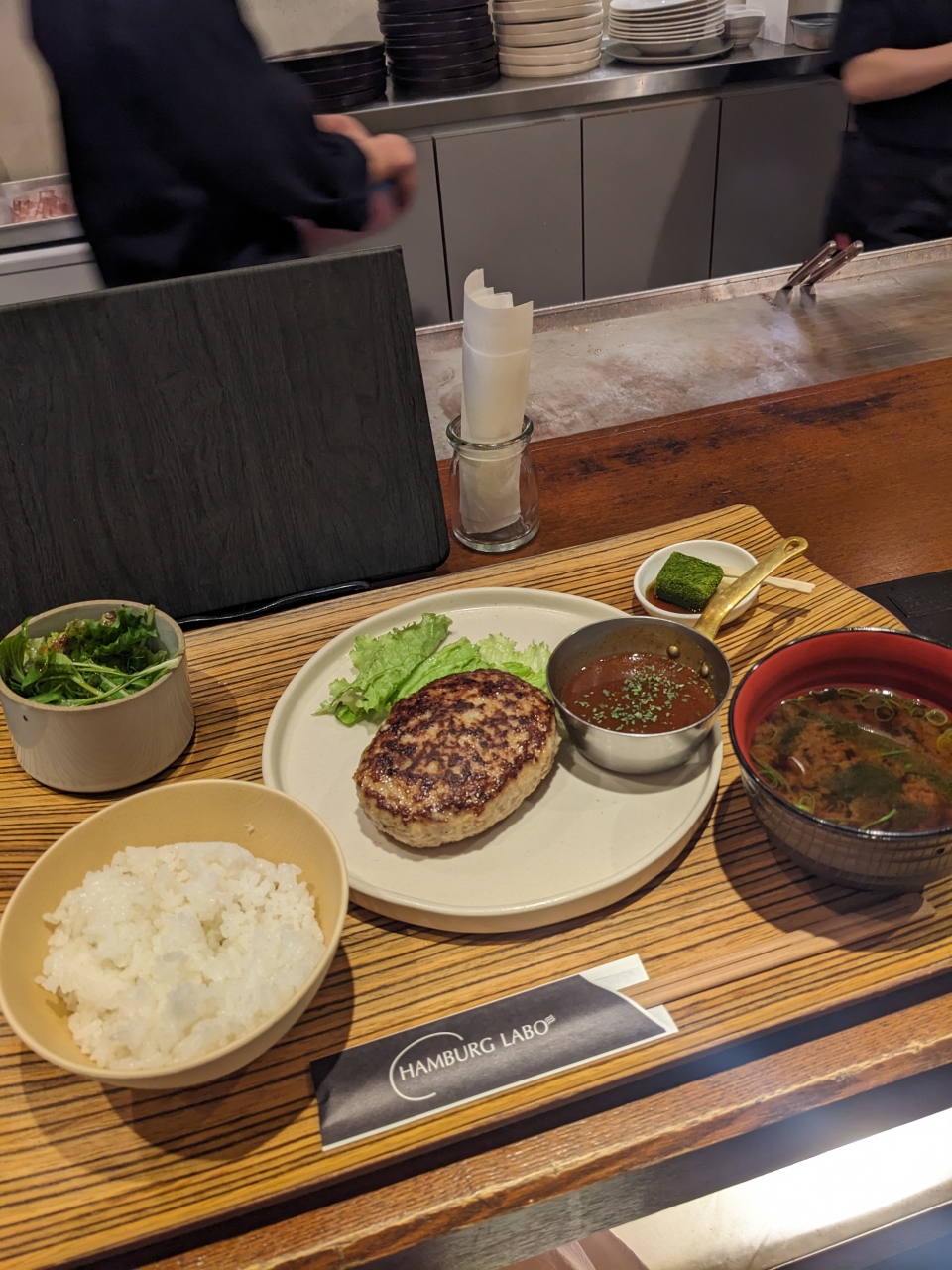 ランチタイムのハンバーグランチ(京都ポーク100%)は、ご飯と味噌汁、小鉢がついて1,300円とお得です(夜はハンバーグのみで1,400円)。おまけに美味しい。カウンター席はひとり客も多く、年代も様々なので入りやすいと思います。