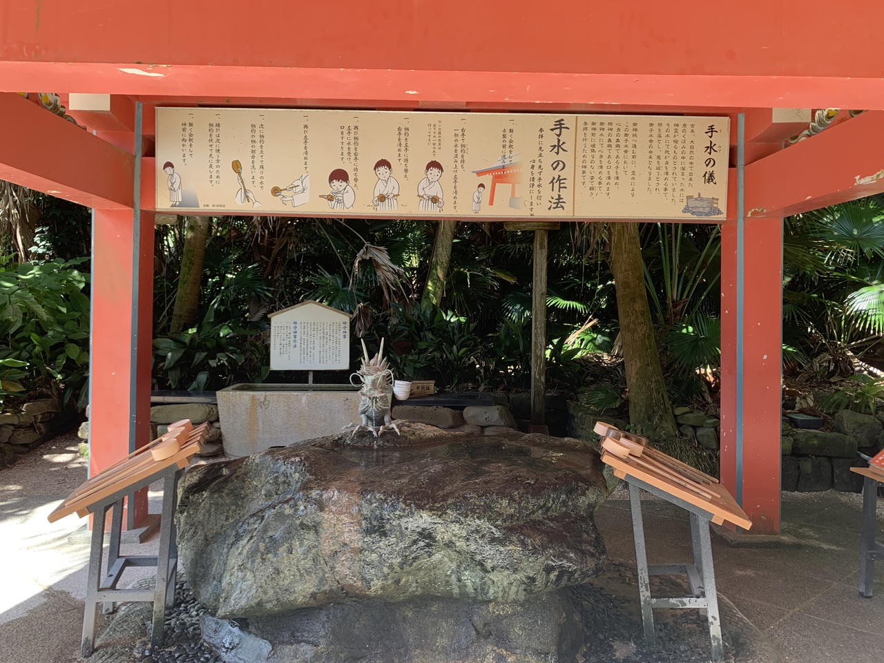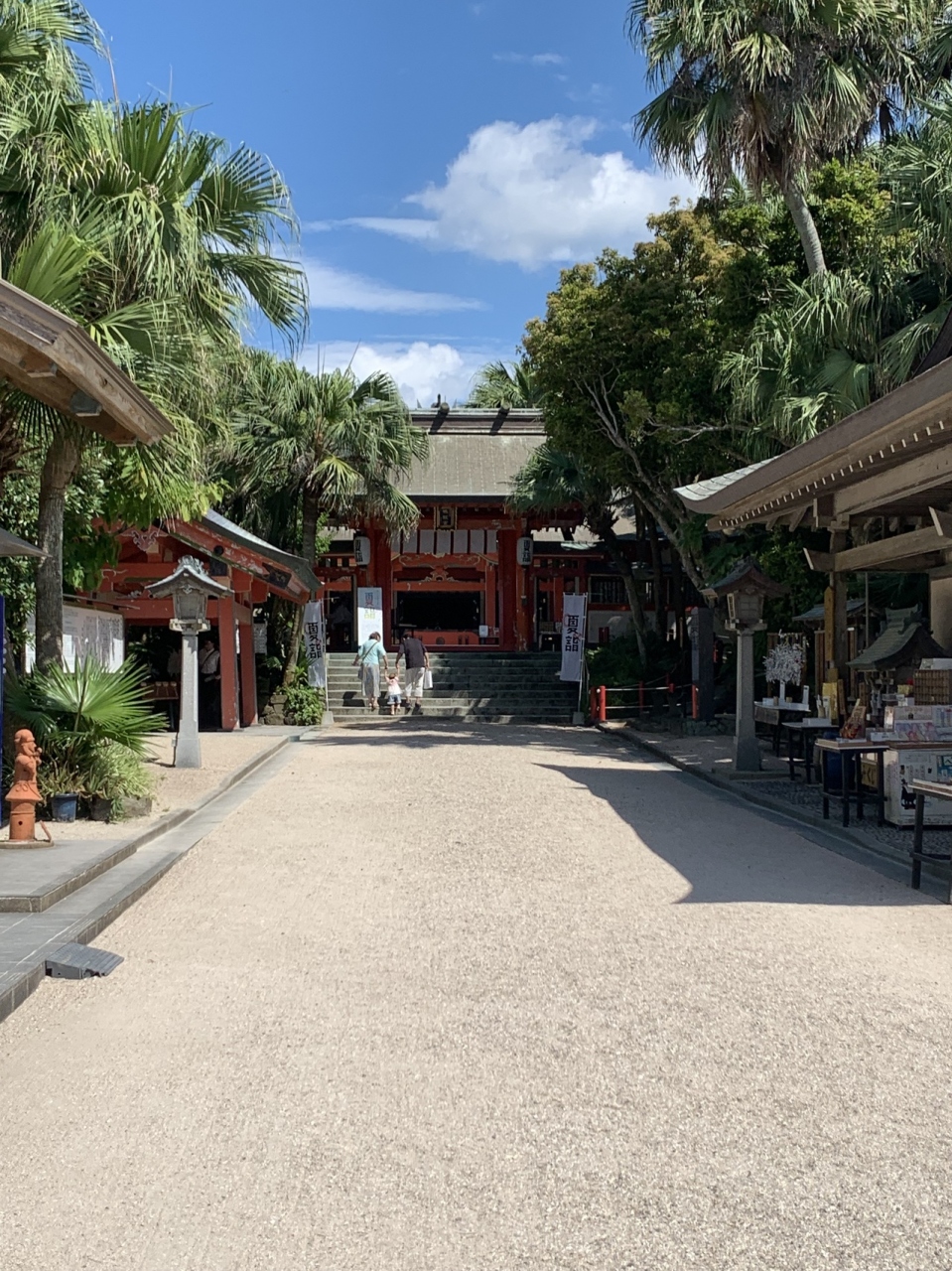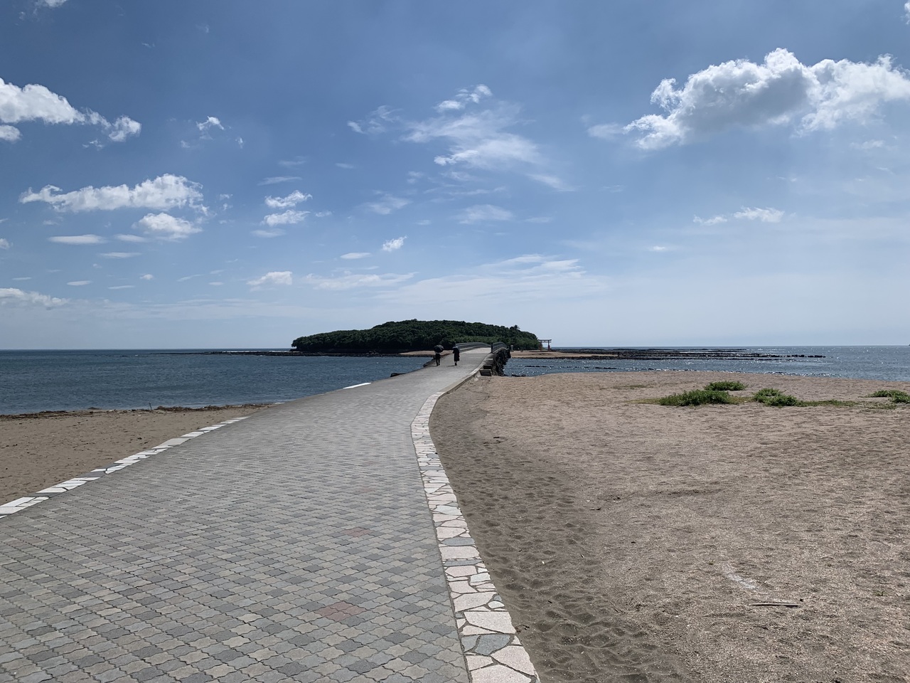 海水浴場を見て真夏の強い日差しの中、海を感じながら、有名な鬼の洗濯板という名の石を見ながら、海を渡ると小島の中に神社がありました。青い空と青い海と素敵なシチュエーションの中に、伝統的な神社が映えます。