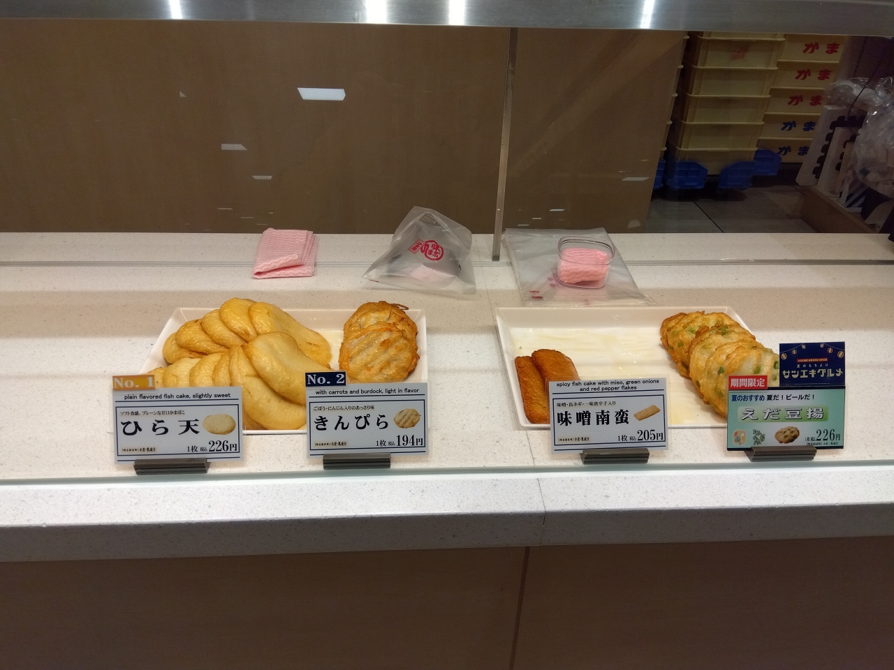 遅い時間で、ショーケースに残っていたのは、人気No.1ひら天226円、人気No.2きんぴら、期間限定えだまめ226円、味噌南蛮205円の4種類だけでした。