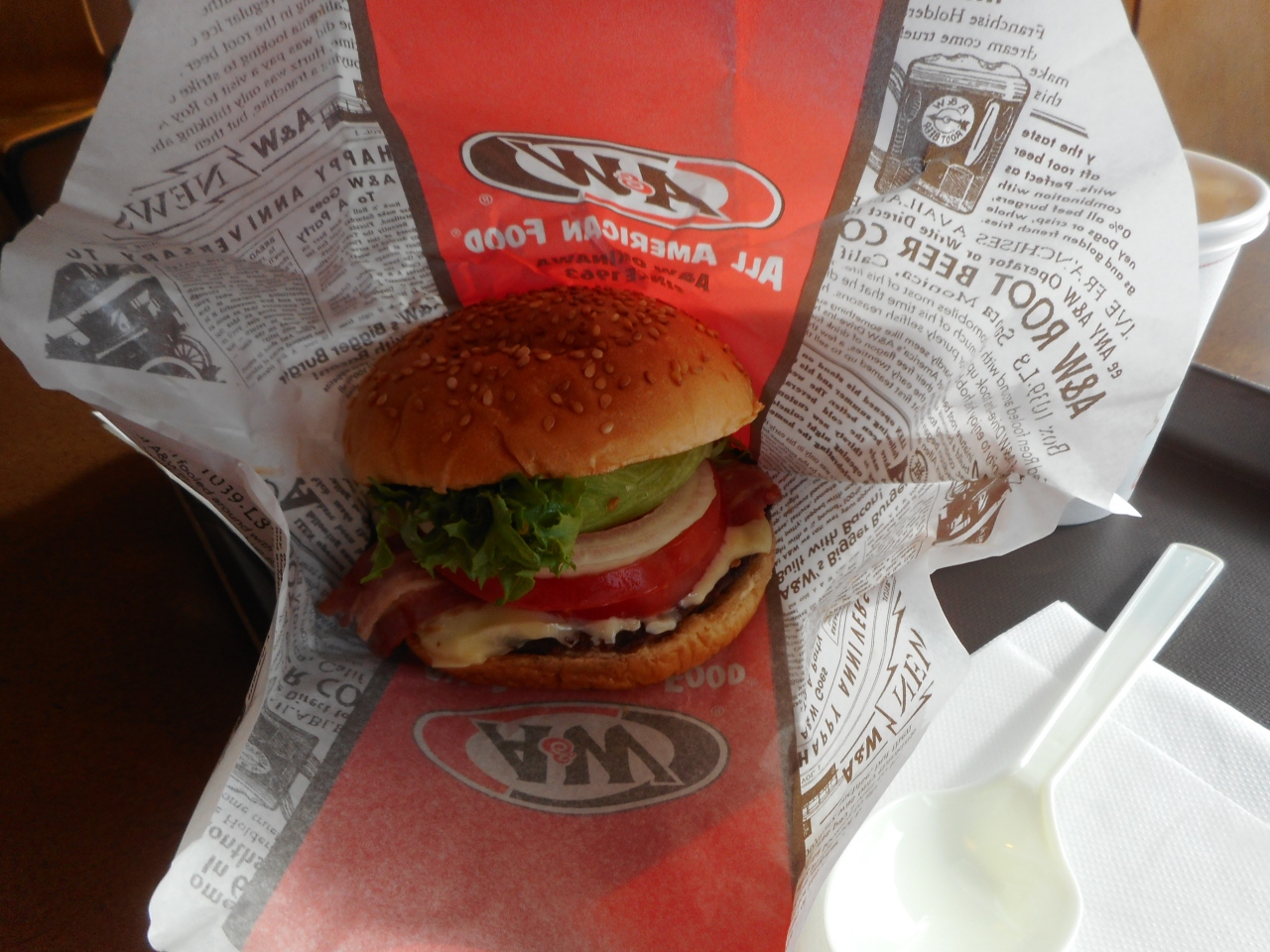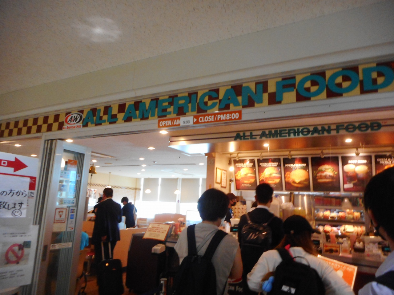 A&Wは人気のハンバーガー店で那覇空港の3階に在りました。JALカウンターの後ろに在り店内のガラス窓から空港の飛行機が離発着する様子を見ながら食事しました。那覇の街中にも出店が在りましたが、那覇空港で帰りの離発便前のランチに利用しました。