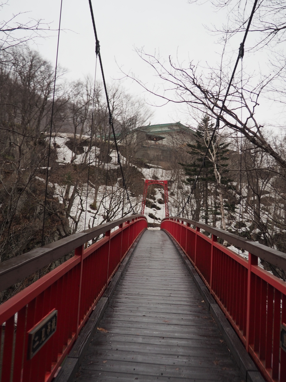 公園の奥に進むと、豊平川に吊り橋がかかり、渓谷を一望できます。