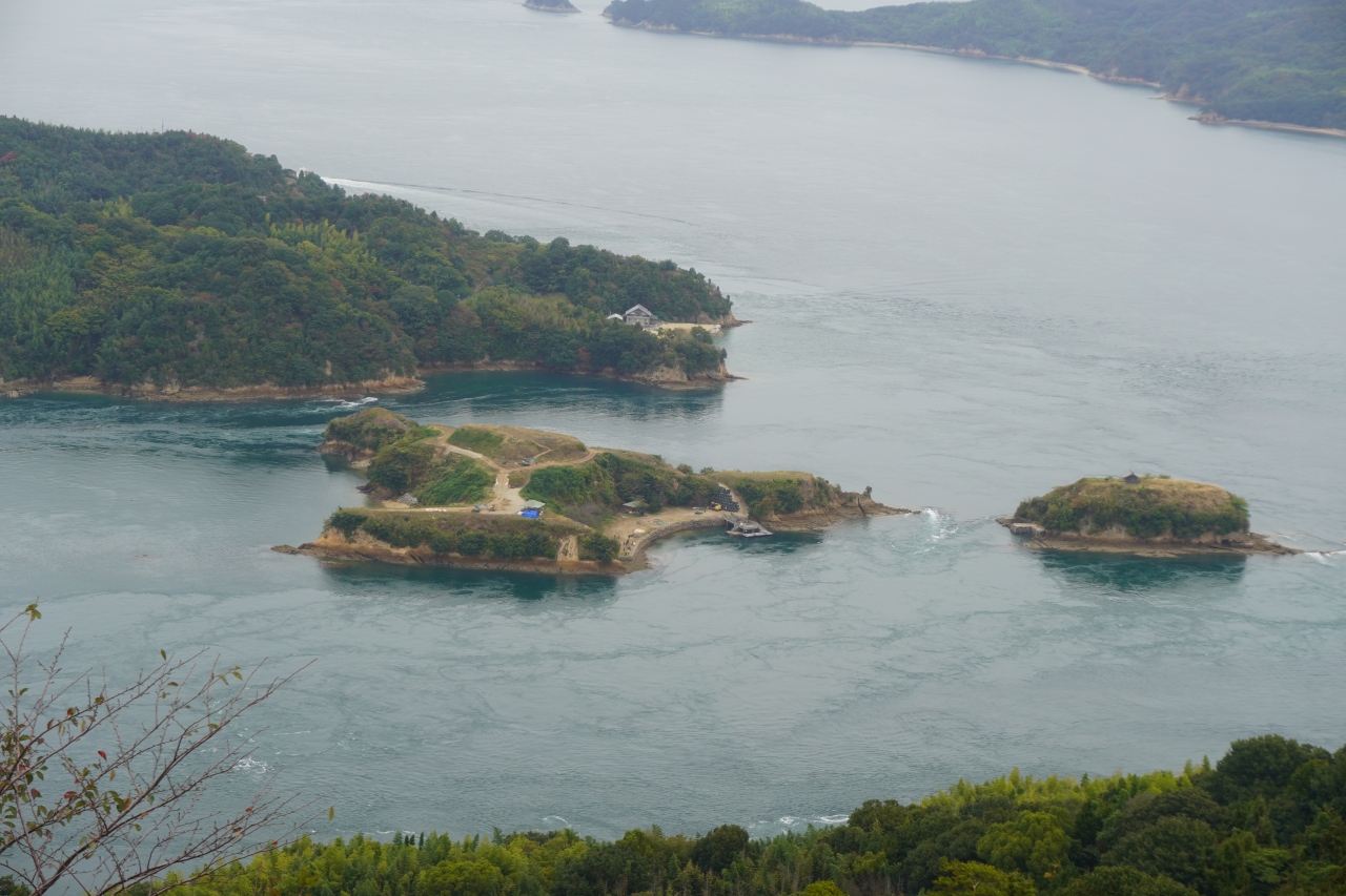 能島城跡は、伯方島と大島の間の海域。鵜島から南側に、豆粒ほどの能島と鯛崎島が連なっていて、真ん中の能島に能島村上氏の拠点だった城跡が残っています。能島は周囲約720mの今では無人島ですが、周囲は激しい潮の流れがあって、それが島の守りにはとても都合がよかったということ。城跡はよく整備されているのが遠めでも分かります。