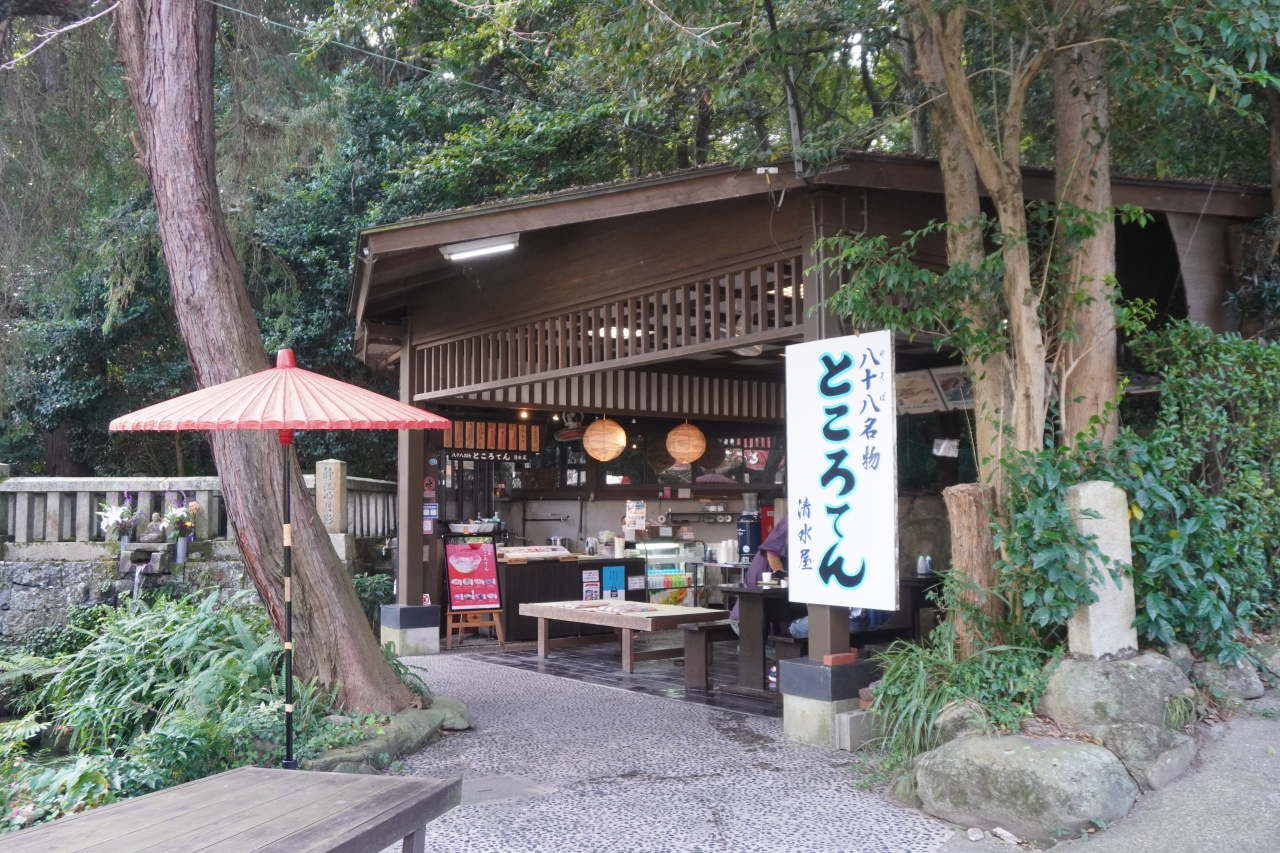 弥蘇場は、八十場にある湧水。その昔、讃留霊王が瀬戸内海の悪魚を退治したのですが、その際、悪魚の毒により瀕死の重傷を負った兵士たち88人がこの水で蘇ったという伝説があるよう。傍らにはところてんで有名な清水屋というお店があって、こちらもとても有名です。