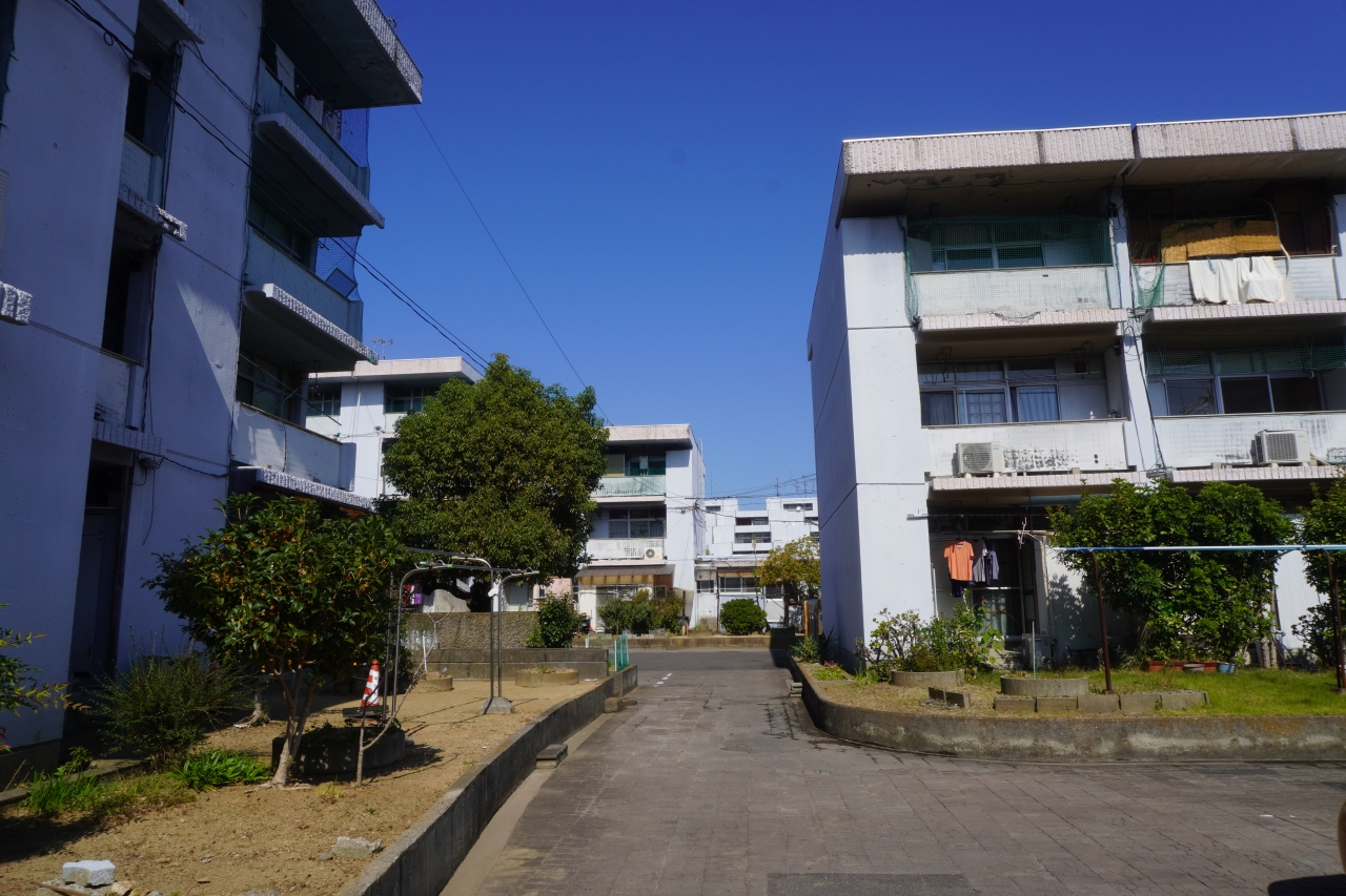 坂出人工土地は、坂出駅からすぐの商店街。商店街の上階が改めてアパートとかが建つ住宅地となっているという二重の構造になっています。一階は普通の商店街だし、上階もここが商店街の上階であることを忘れさせるくらい普通の住宅地。路地や植栽とか本当に普通の景色です。