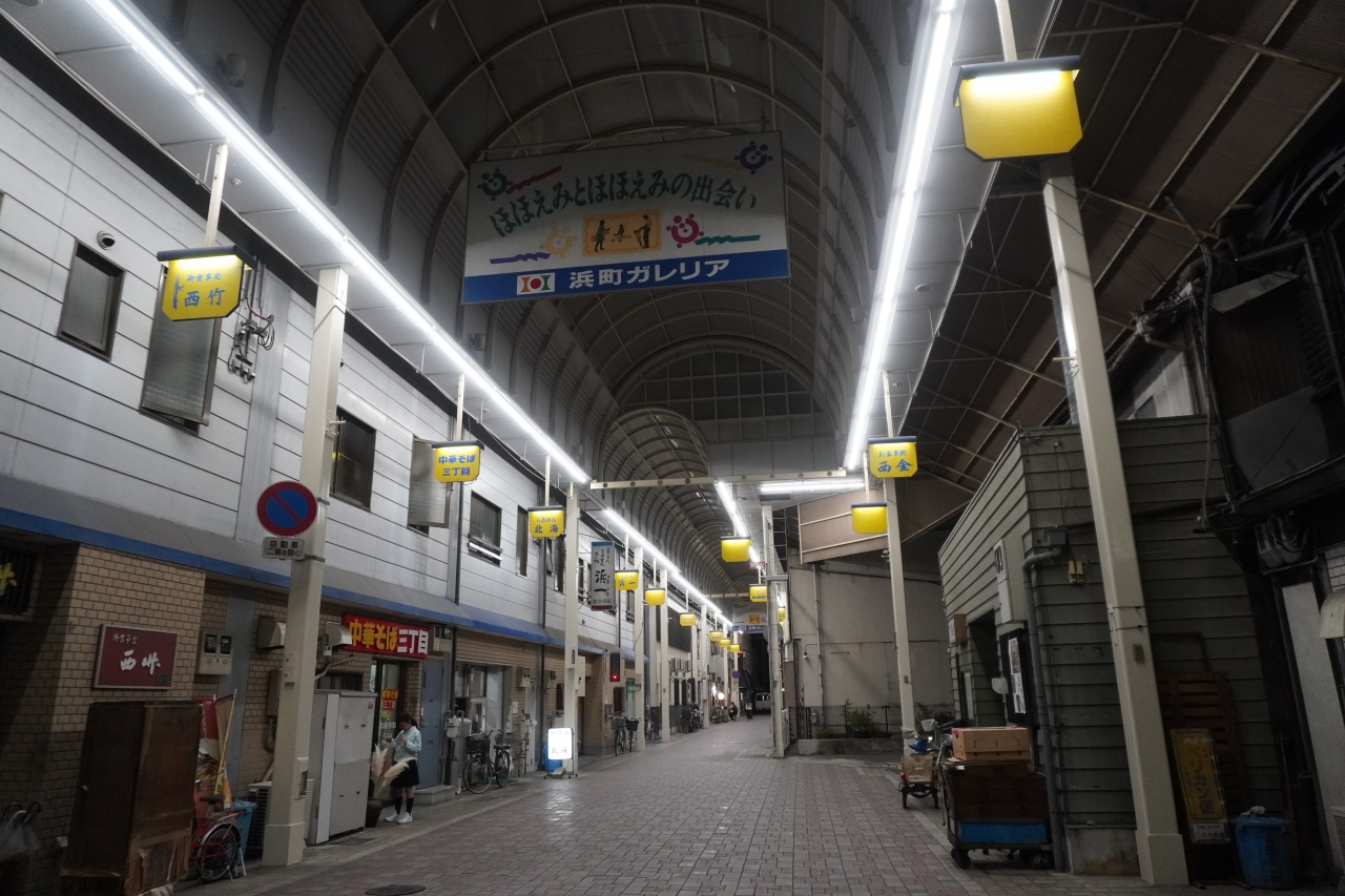 浜町ガレリアは、丸亀駅の東側すぐ。南北に延びる本町商店街に、浜町ガレリアと浜町商店街が東西に並行して延びるという関係。浜町ガレリアは、立派なアーケードを備えていますが、けっこう短め。夜だと渋めの飲食店が目立っています。