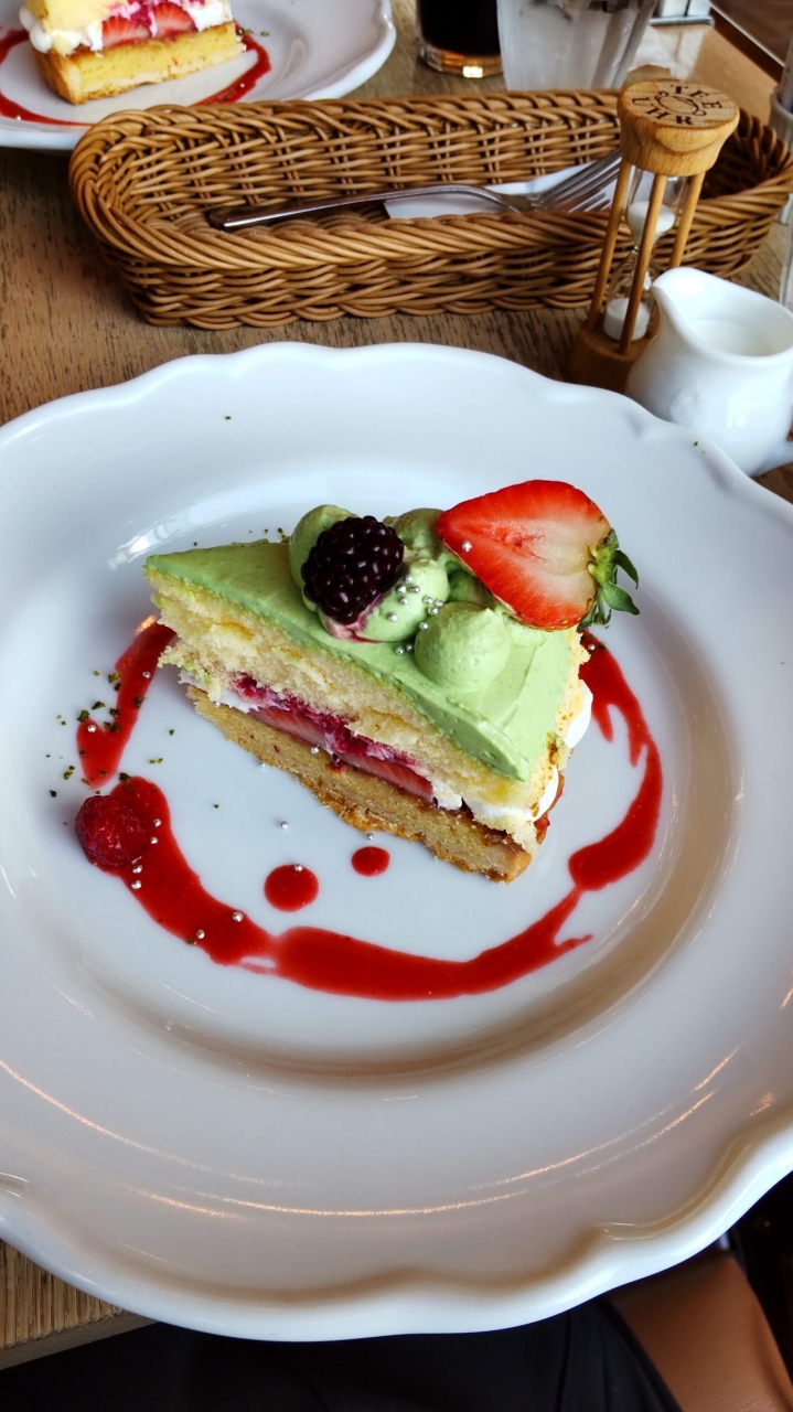 窓が大きく開放感があり、季節によって眺めを楽しむ事が出来ます。11月中旬のこの日は、紅葉を観ながら限定メニューのピスタチオとベリーのケーキを頂きました。