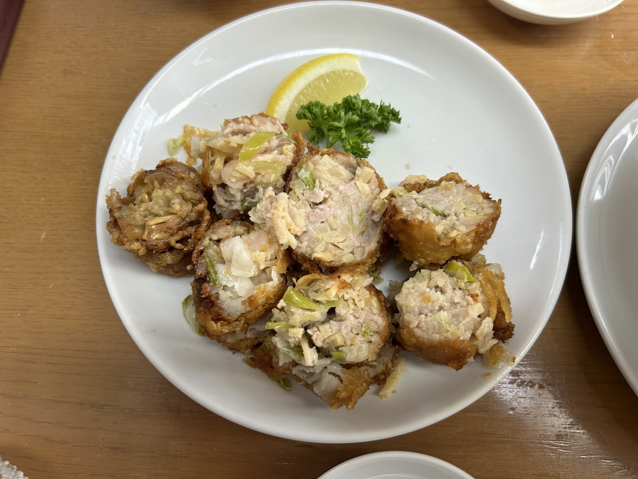 一人一品のご注文を‥という事で、本命海老ワンタン(800円)とお店の人もお勧めのマキアゲ(1800円)を注文。マキアゲは色々な具材を腸で包んであげたもので珍しいとのことで値段も見ないで決めたけれど、レシートを見てびっくり!空腹だったりビールでもあったら美味しかっただろうけど、私たちにはちょっと重め・・