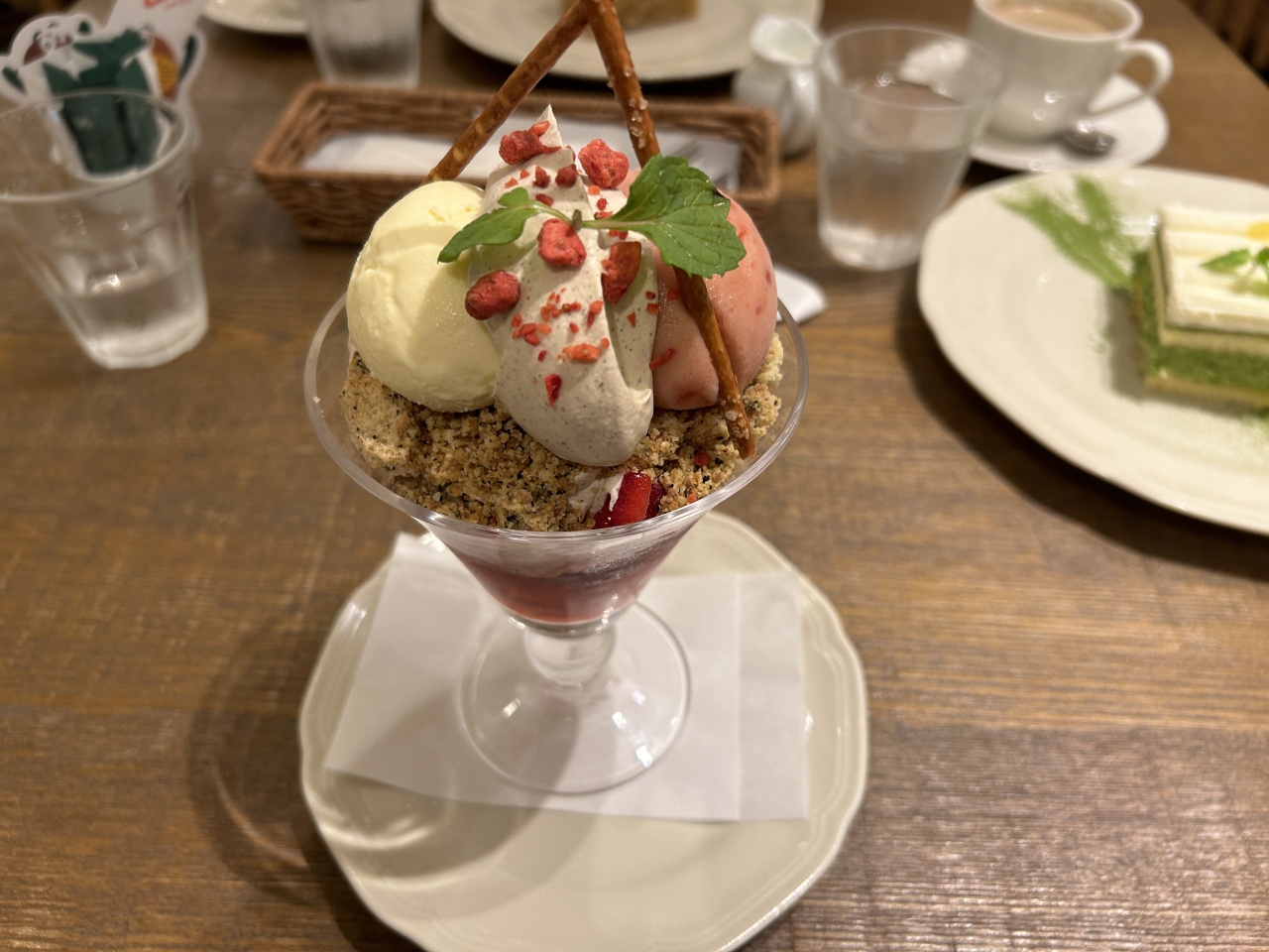 頂いたのはアールグレイパフェ(1350円)。アフタヌーンティーセットと悩んだけれど、初心を貫いてパフェにしました。2種類のアイスが暑い日にはありがたい・・美味しくいただきました。
