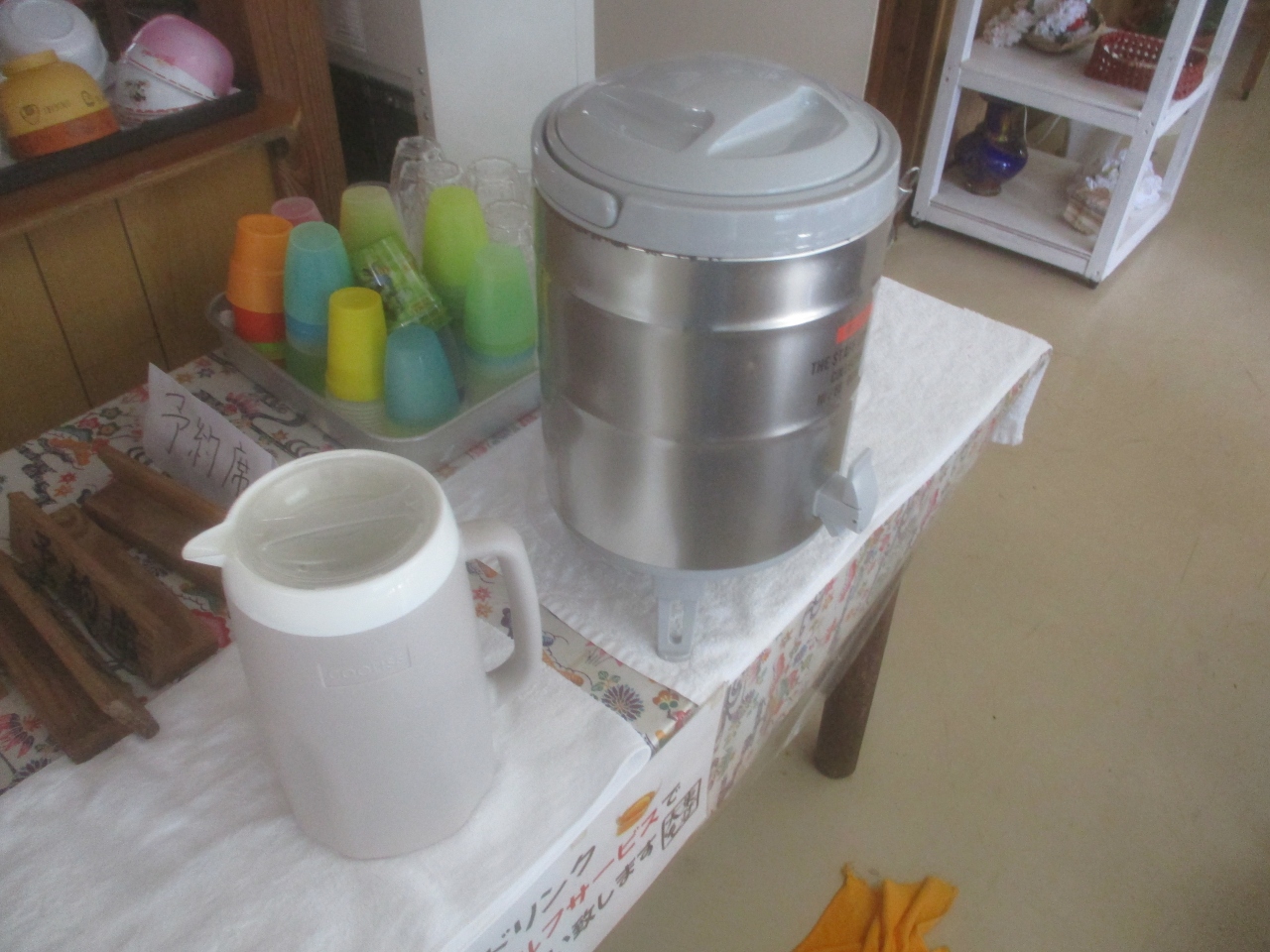 大東そば 伊佐商店の店内には冷たい水やお茶が用意されていました。お客さんが自分でコップを取り、セルフで汲んで座席まで運ぶと言うスタイルでした。11月とは言え、温かい島なので、喉がとても乾いており、ここで冷たい水分を補給できました。