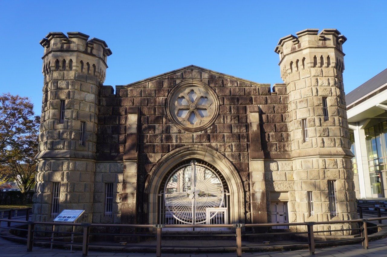 鹿児島アリーナは、鹿児島市が設置した立派なスポーツ施設なんですが、観光の見どころは敷地内に残る旧鹿児島刑務所の正門。旧鹿児島刑務所は、明治41年に建てられた千葉・金沢・奈良・長崎と並ぶ明治の五大監獄。その中で、唯一鹿児島刑務所だけが石造だったということ。傍らにはほかの監獄の正門の説明もあって、確かに他はレンガ造りです。