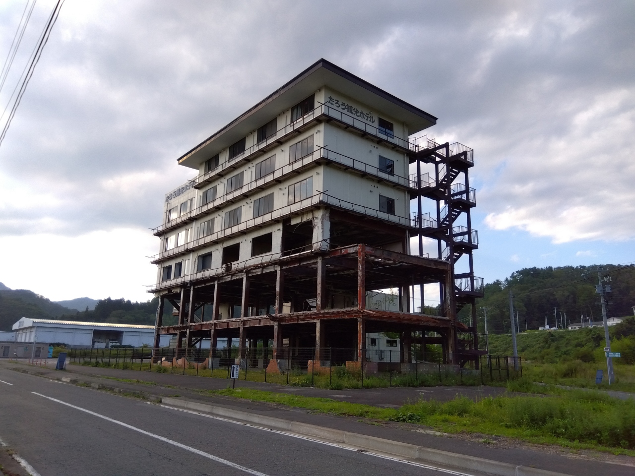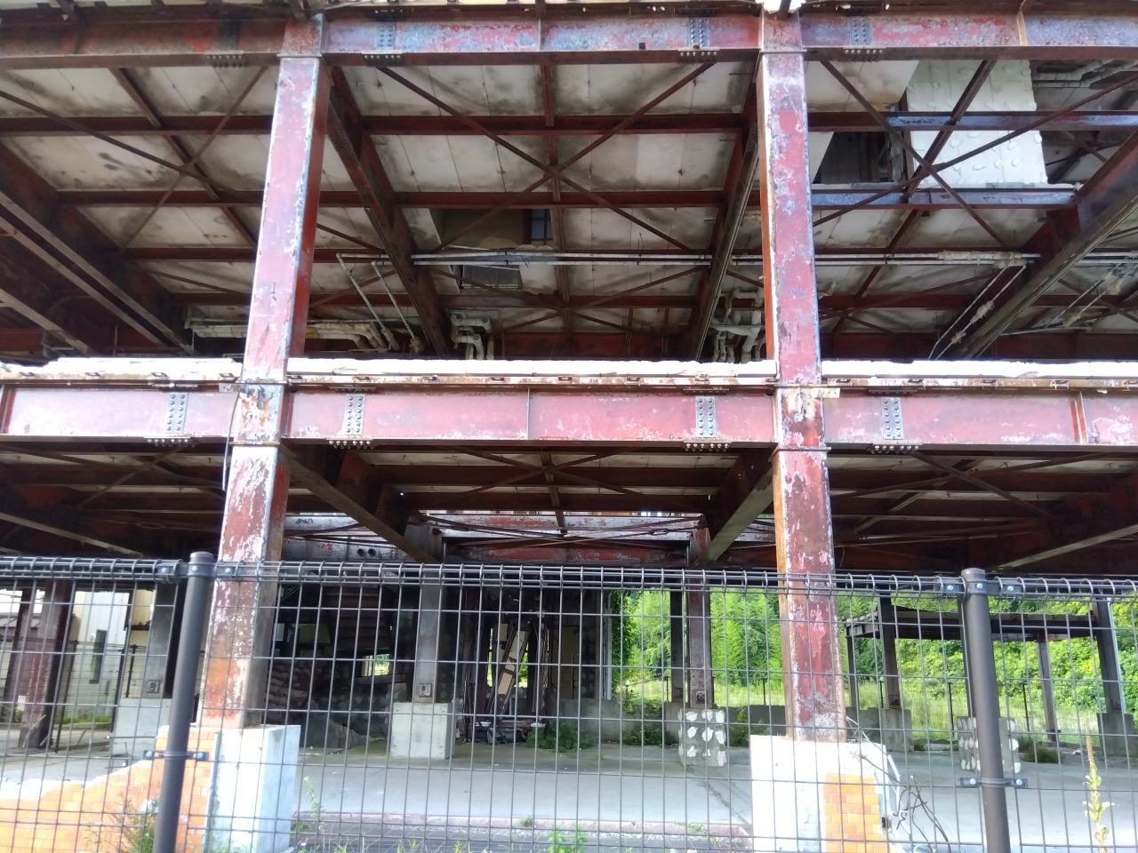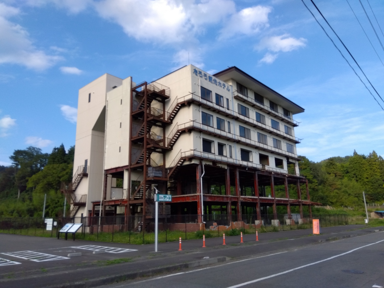 東日本大震災の大津波により建物の4階まで浸水、1階と2階は剥鉄骨だけ、3階は部分的に外壁が残っていました。