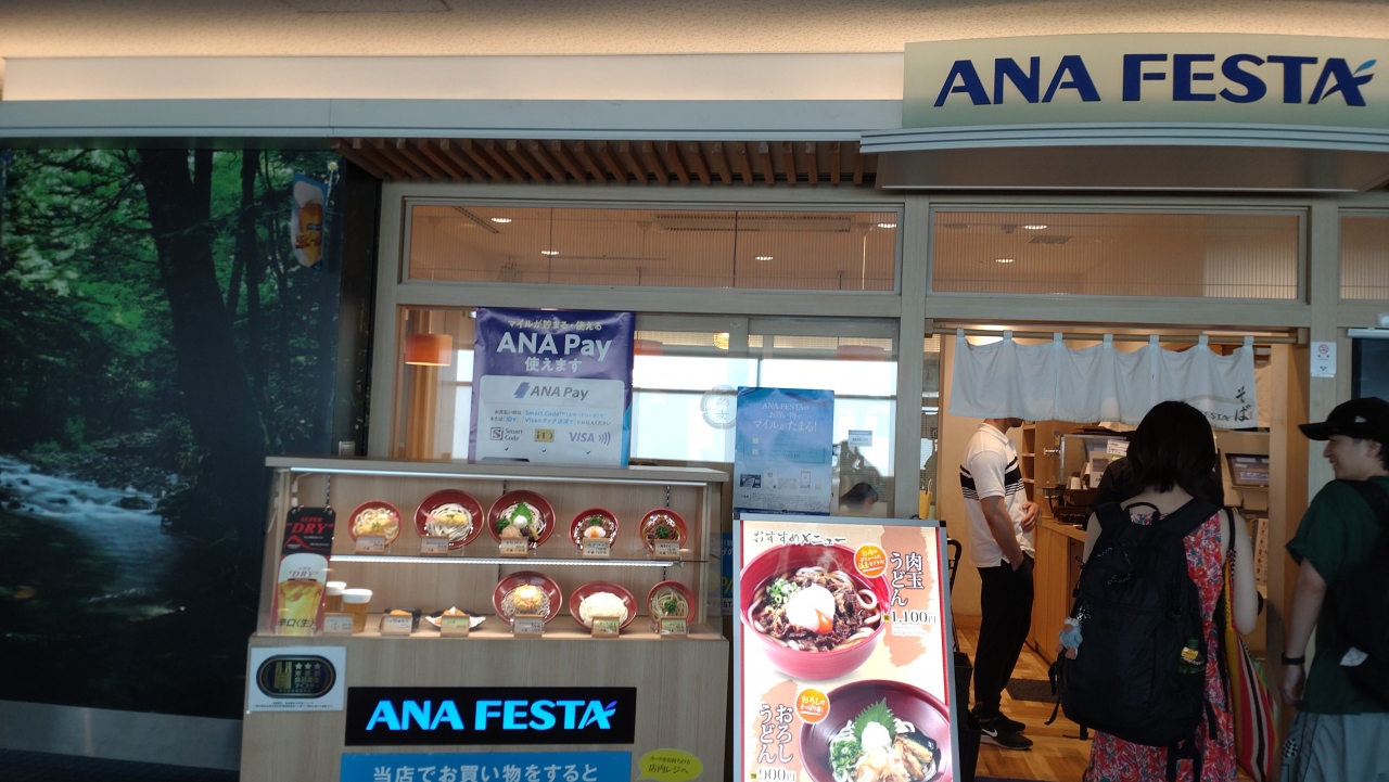 ANA(AIRDO共同運航)搭乗口近くにあるうどんとお蕎麦のお店です。お昼も近かったので店内も混雑、自販機で食券購入するも空席待ちでした。自販機も不慣れでお店の方に教えて貰いながらの購入、かき揚げざる蕎麦食べるのもドキドキでした。