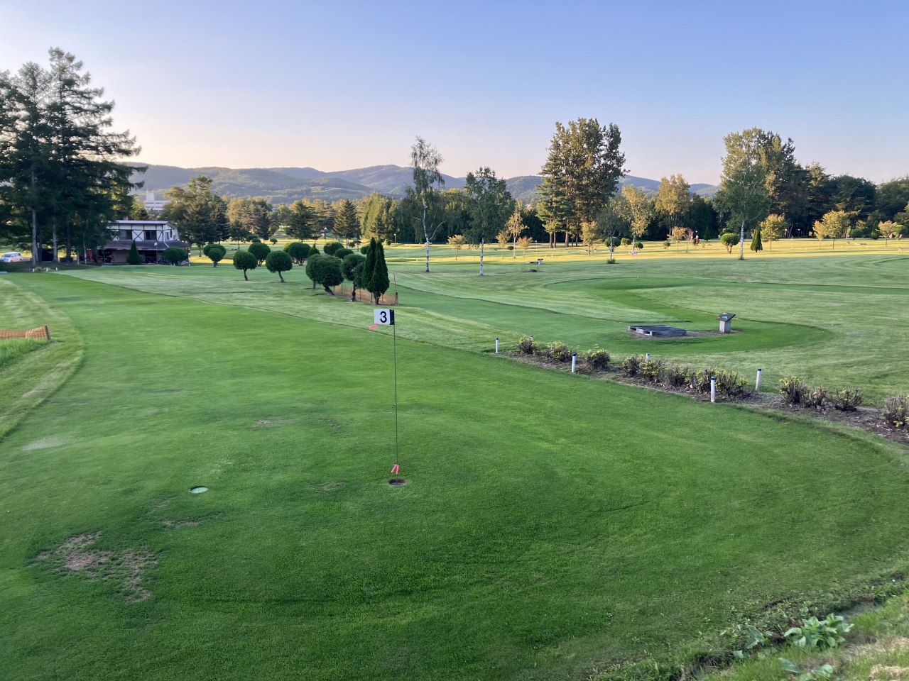 山あいの地の広大なキャンプ場とパークゴルフ場