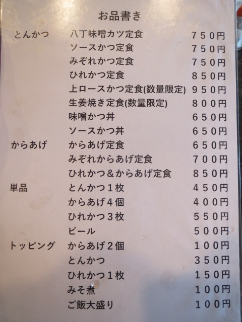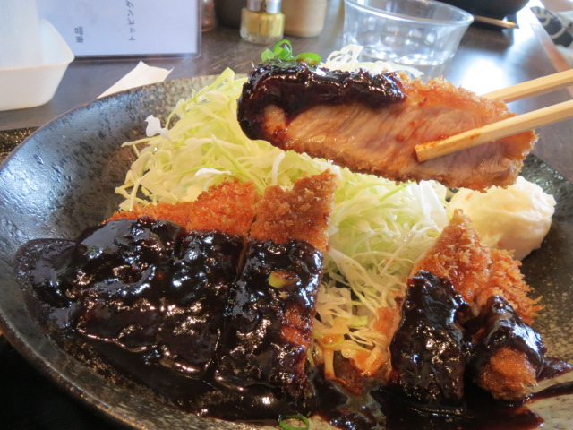 人気のあるとんかつ店でノミネートされるお店です。6席のカウンター席だけの店、親子だけで切り盛りしているようだ。オーダーしたのは八丁味噌カツ定食。厨房では注文が入る度に、タイマーを使って揚げている。カツ定食はキャベツがたっぷり。ポテトサラダが少し、小鉢の漬物、味噌汁はミックス味噌。サクサクっとしたとんかつにやや濃い味の八丁味噌がかかる。適度な脂身。厚みは2センチほど。通常より厚みがある。ポークの旨みが凝縮。ご飯は普通サイズでも大盛りに近い。ちなみに大盛りは別途\100追加。ご飯の味もいい。実にコスパがいいトンカツ店でした。
