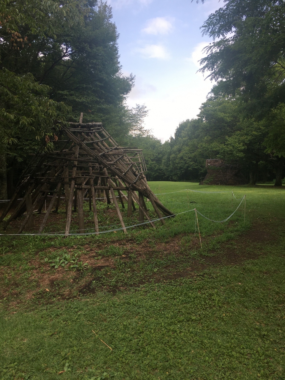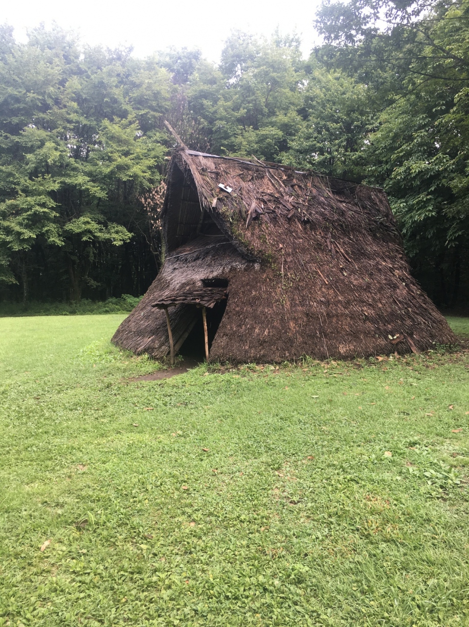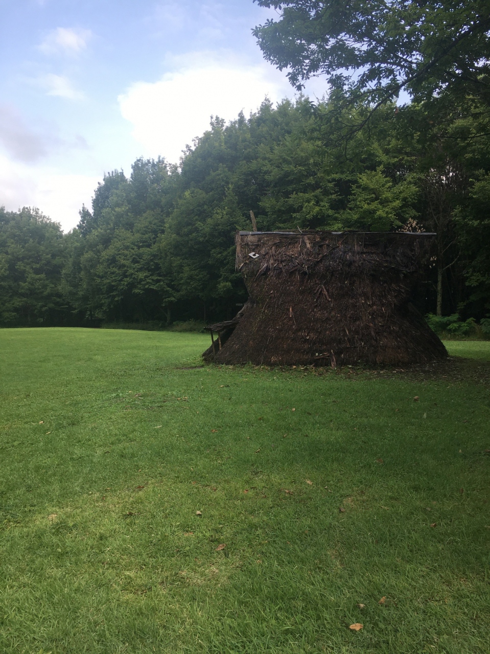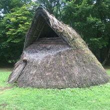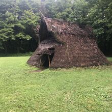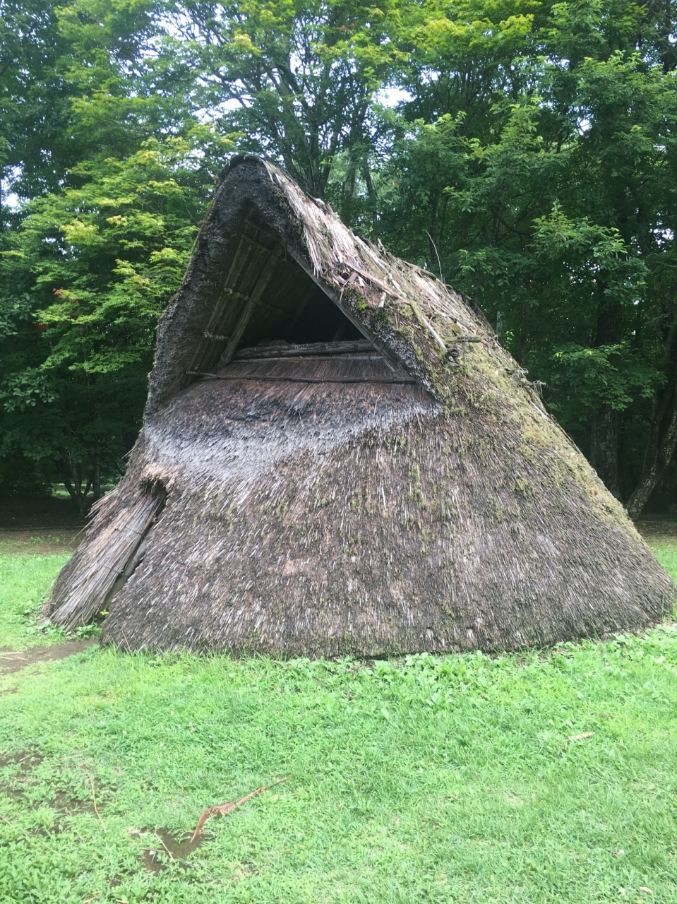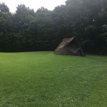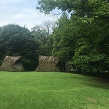 芝生のようなエリアに縄文中期後半の住居跡が6つあり住居跡にはも入ることが出来ます。藁で出来ていて木組もしっかりしていました。中に入ると地面が土でした。周りには木々があり広いエリアなので解放感がある場所でした。