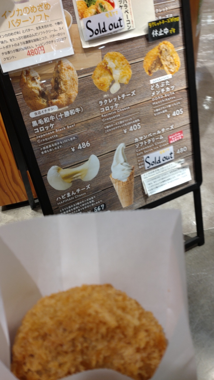 空港2階の奥にどさんこ産直市場があります。その区画に十勝管内の産物使った商品見られるのが十勝Valiysです。ソフトクリームやコロッケ、メンチカツも食べられ、¥405のどろぶたメンチカツを食べましたが美味でした。どろぶたは十勝のブランド豚で、放牧期間が長く、肉質柔らか、脂も味わい深く栄養価から「脚のついたオリーブオイル」とも呼ばれてるそうです。