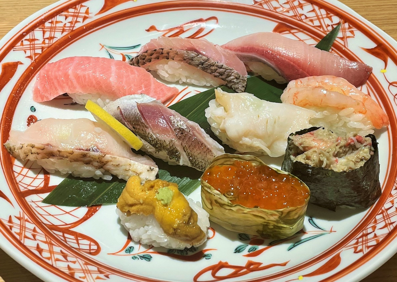 ウニ・イクラ・トロ・ブリ・のどぐろ等の高級ネタが10貫、どれも新鮮で旨い。