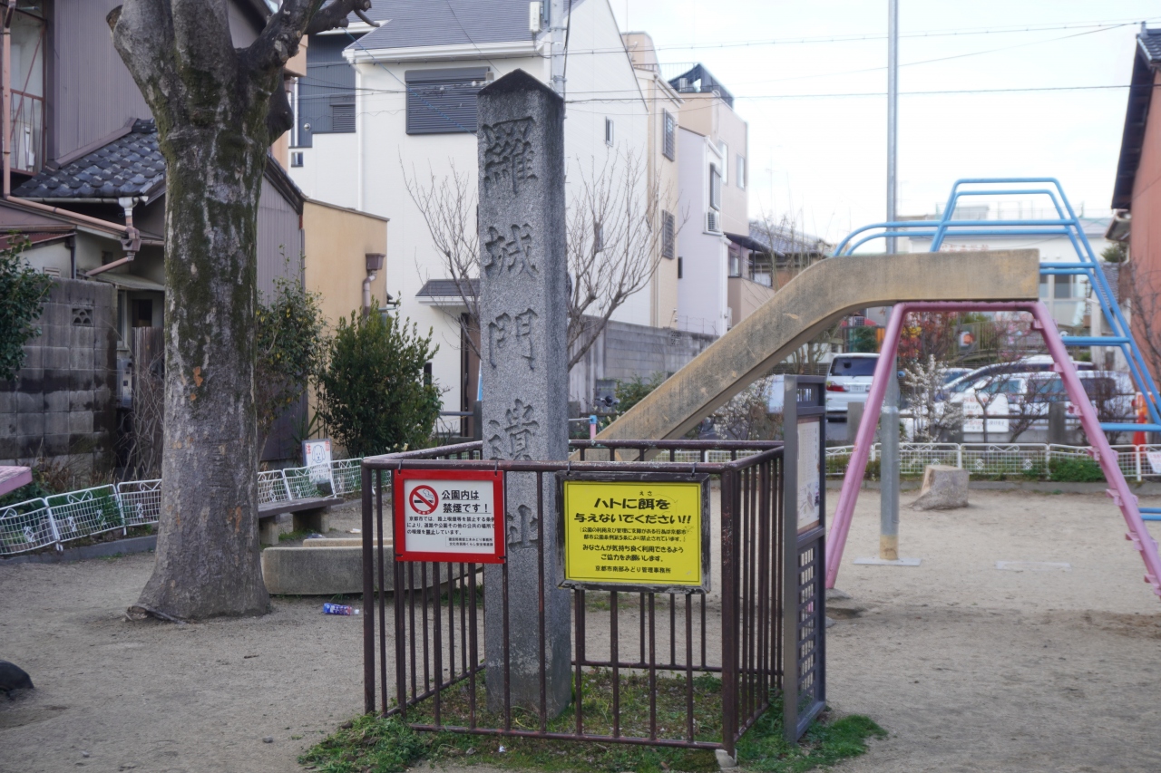 羅城門は、延暦13年(794年)に建てられた平安京の正門。平城京の中央部、南端に置かれ、北端の朱雀門と相対する形。門は正面33m、奥行8m。二重閣瓦屋根造で棟の両端には金色の鴟尾を置くというもの。弘仁7年(816年)に大風で大破。天元3年(980年)に再び暴風雨で倒壊。以降は再建されることがなかったということ。碑は公園のような場所に金属の柵で囲われてありました。