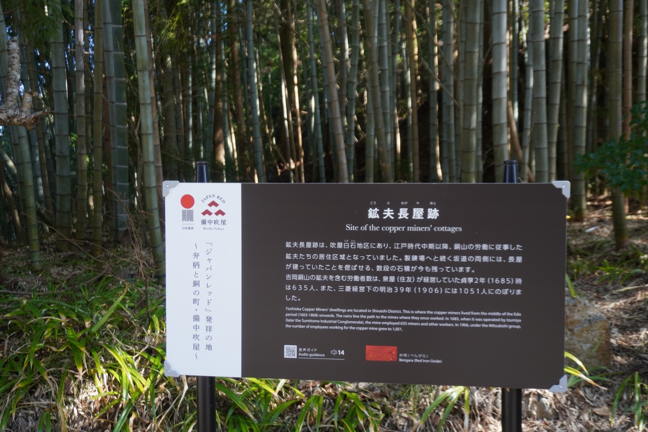 鉱夫長屋跡は、吹屋ふるさと村のメインストリートから坂を上って旧吹屋小学校に向かう途中。
