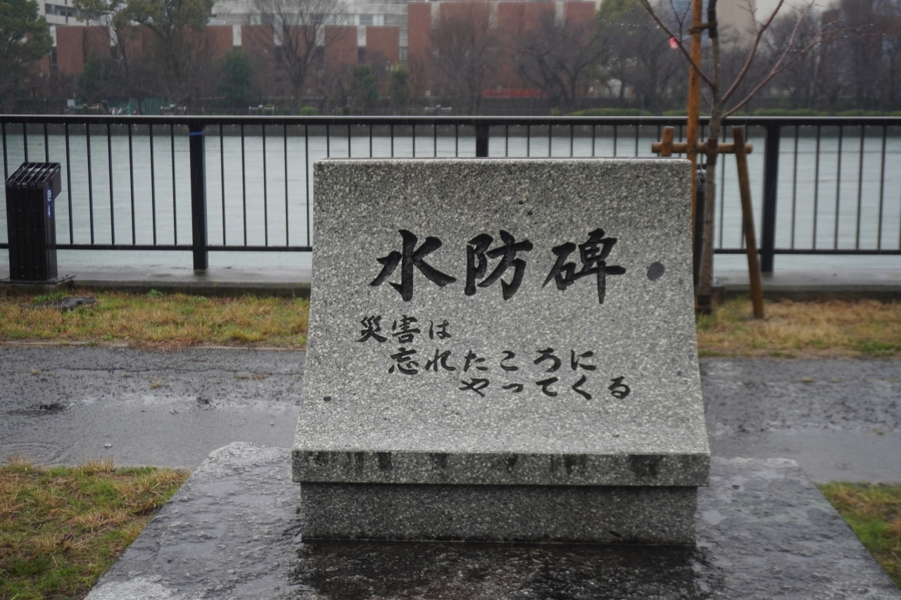 水防碑は、旧藤田邸庭園の裏側、大川沿いの遊歩道脇にあります。碑には、「災害は忘れたころにやってくる」と刻まれているだけですが、明治18年の大洪水では、東成郡27か村が水中に没したということ。今も異常気象が云々言われていますから、それなりの備えは必要です。