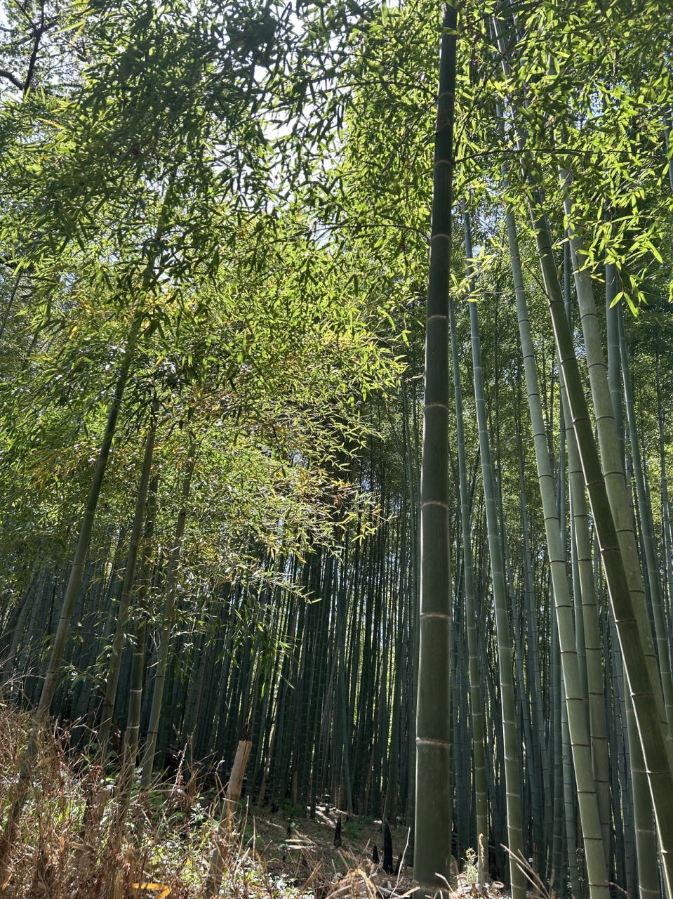 気になって少し登ってみると、竹取物語の世界のような竹藪の前に、まるで私たちにこちらに来るように促すような態度で、黒い猫が立っていたのです。