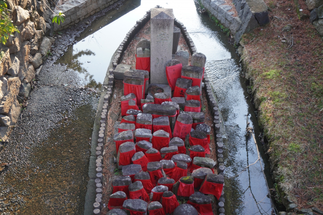 率川地蔵尊は、猿沢の池の西側に架かる石橋の上から下をのぞき込むと見えるのですが、赤い布でくるまれた石の地蔵がぎっしり。護岸工事が行われる度にお地蔵様の数は増えるというのですが、つまり、廃仏毀釈で川に捨てられて地蔵なのだとか。ちょっと微妙なお地蔵です。