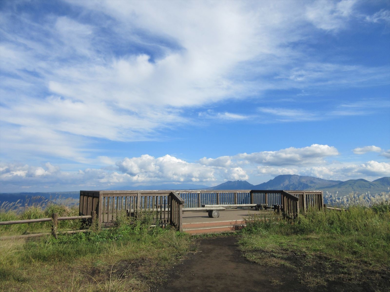 展望台は駐車場から道路を挟んで反対側。眺めはとても素晴らしいです。外輪山から内牧方面、その先に阿蘇五岳の雄大な景色が見えます。