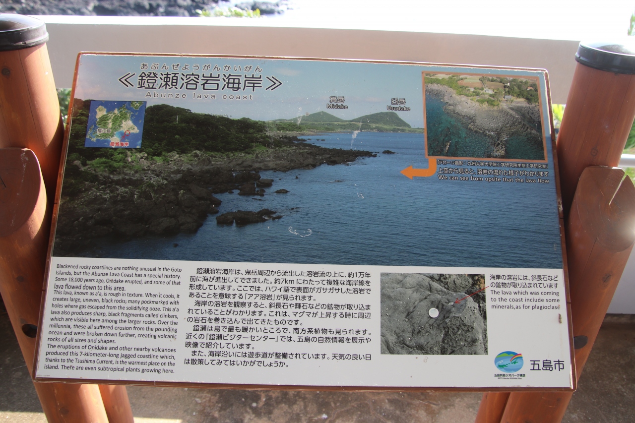 鬼岳や火ノ岳から流れてきた溶岩からなり、黒々でゴツゴツした岩の海岸が7kmにわたり続いています。鐙瀬ビジターセンターや展望台、遊歩道などがあり、美しい風景を楽しめmます。展望台からは沖に黒島があります。黒島はかつて漁業で栄え小学校があるほどの人口190人(1960年)がいましたが現在は無人島になっています。