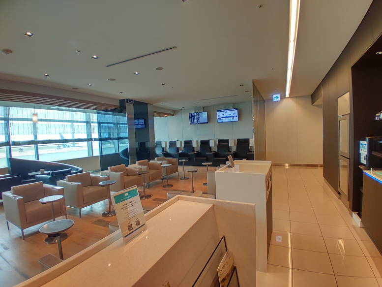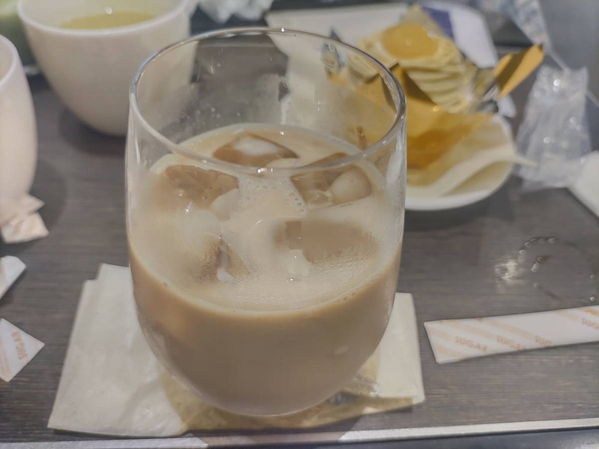 ANAのプレミアムチェックインでチェックインしてから「羽田空港国内線ANAラウンジ (本館南)」に入りました。窓際の席はいっぱいだったので奥の空いているゾーンに入りました。コーヒーと牛乳でアイスカフェラテを作り、不二家で買ってきた「マロンモンブラン」をいただきました。ラウンジにはブルボンの「ちいさなかすていら」が置いてありました。ざらめもついていてなかなかちゃんとした味のお菓子でした。