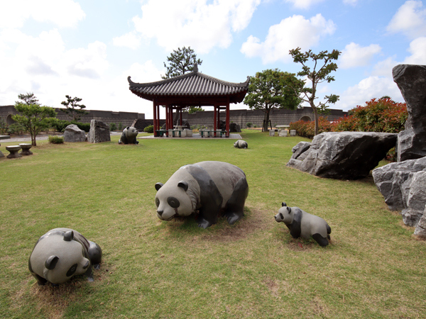 金山嶺橋を渡ると見えてくる芝生広場にはパンダの石像も置かれ、珍しい石造りの顔はめもありました。