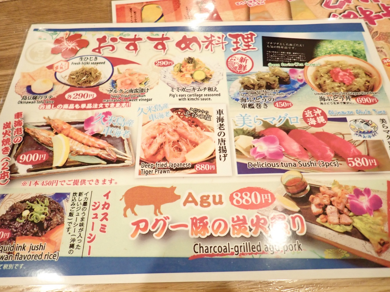 三線ライブが有名な、居酒屋風レストランです。。ホテルの目の前で歩ける気軽さ&いつも混んでいるので、おいしいに違いない!と行ってみました。三線ライブにはあまりこだわりがなかったので、奥の方のテーブルでもOKということで入れました。ライブにこだわる方は予約必須かも。メニューは豊富で、写真入りはありがたい!刺身、さらだ、海老、タコスピザなどなど。豊富なメニューで好みが違っても大丈夫!全部おいしかったです!
