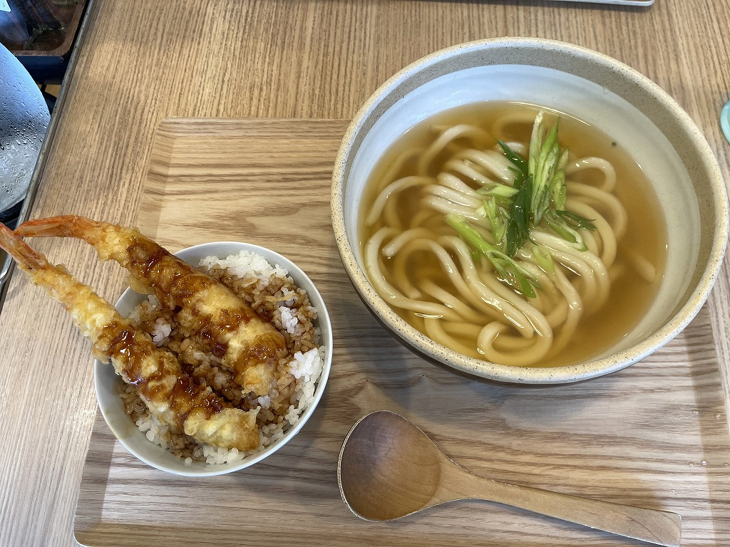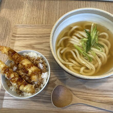 そうすると美味しそうな うどん と 海老2匹ミニ丼が出てきました。