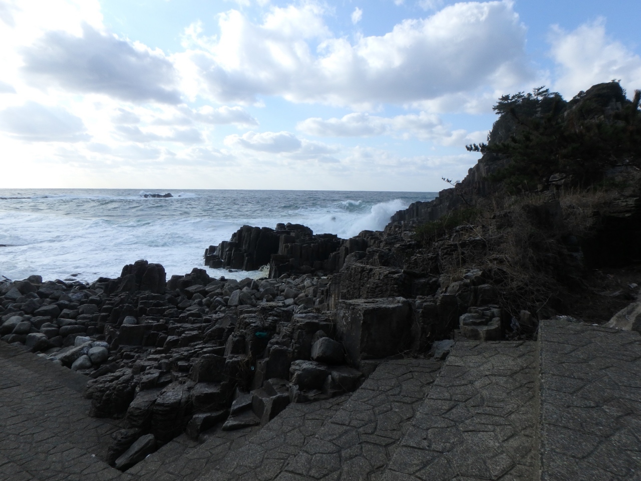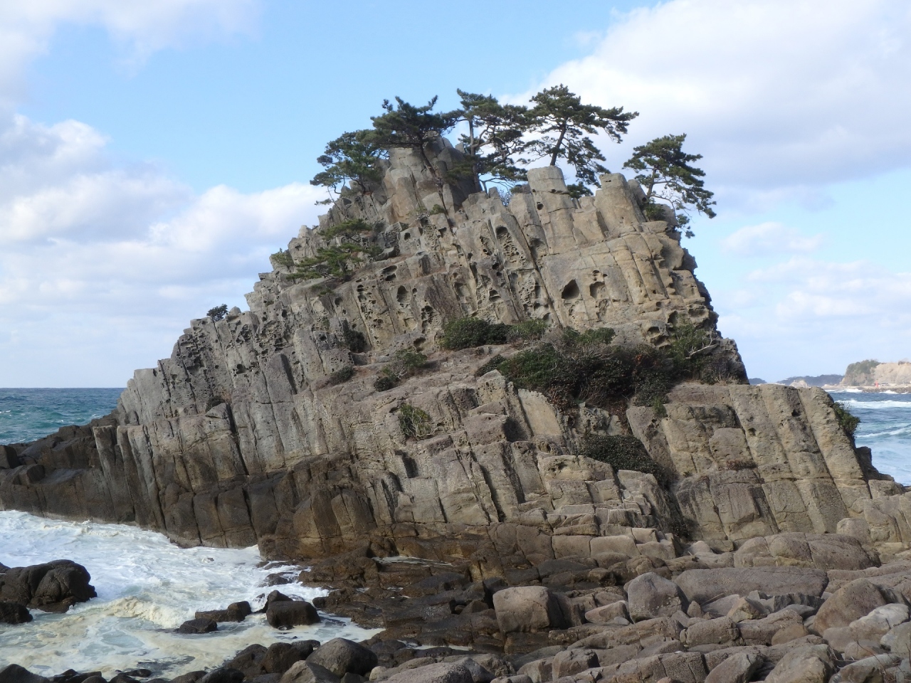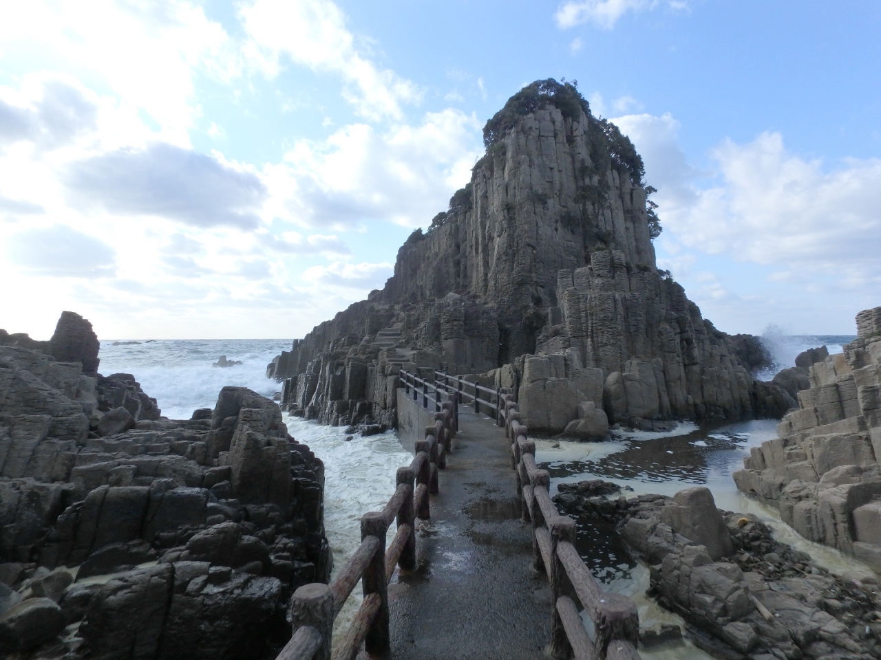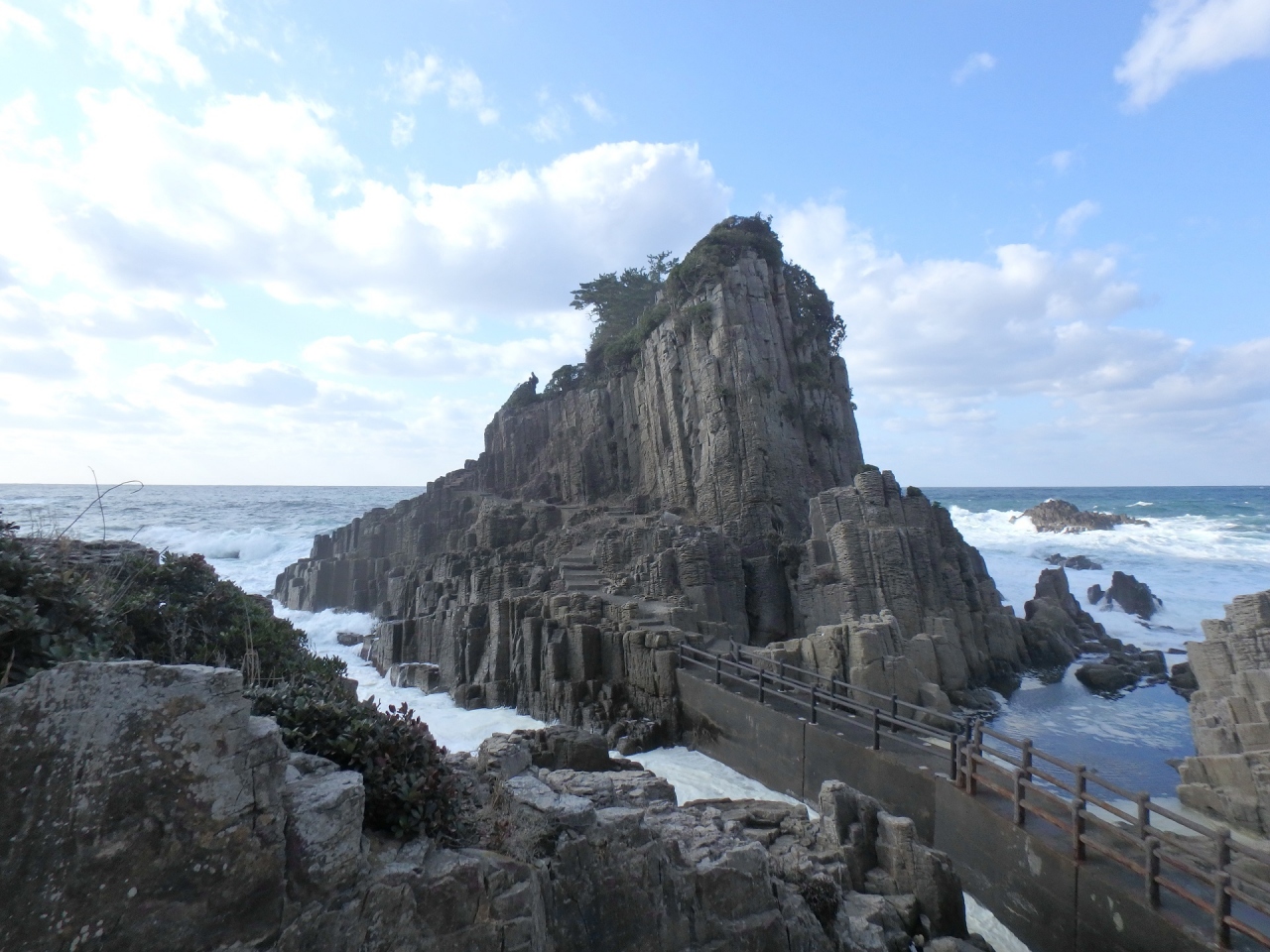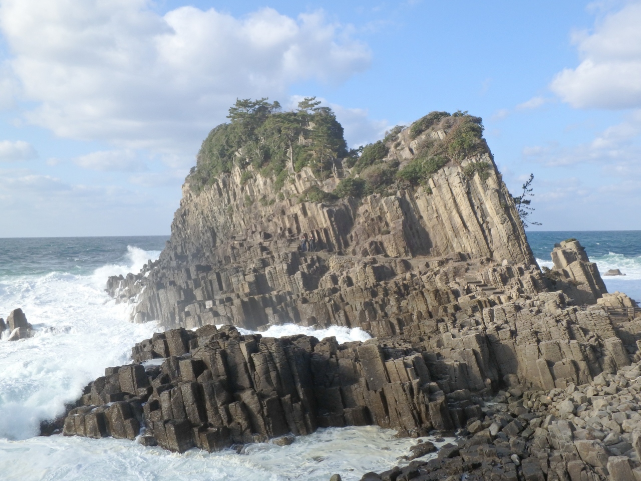 ちょうど接近する台風の影響で大荒れの日本海。その中に浮かぶ鉾島は柱状節理の形状もあって強さを感じる。陸地からは橋がかけられ島に渡ることもできたが時化た状況で諦めた。それでも島につけられた階段部分を歩く人たちがいて驚き。もし次に来ることがあれば、島に行って頂上部分にある祠にお参りしていきたい。