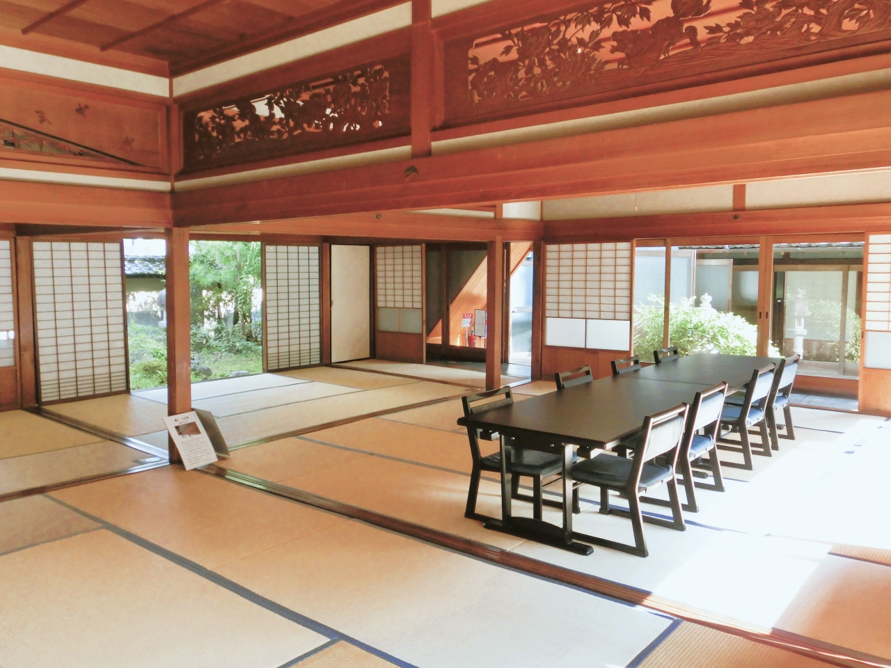離れの大広間は6室60畳から成る広い空間で、その欄間の見事な意匠は牡丹唐獅子に雀に竹、付書院の吹寄花菱格子、2階の欄間は流水に菊と花形窓のシルエットが美しい障子戸…などなど、当時の大工の職人技が光るものばかりで、同時に国内外の銘木がふんだんに使われていました。