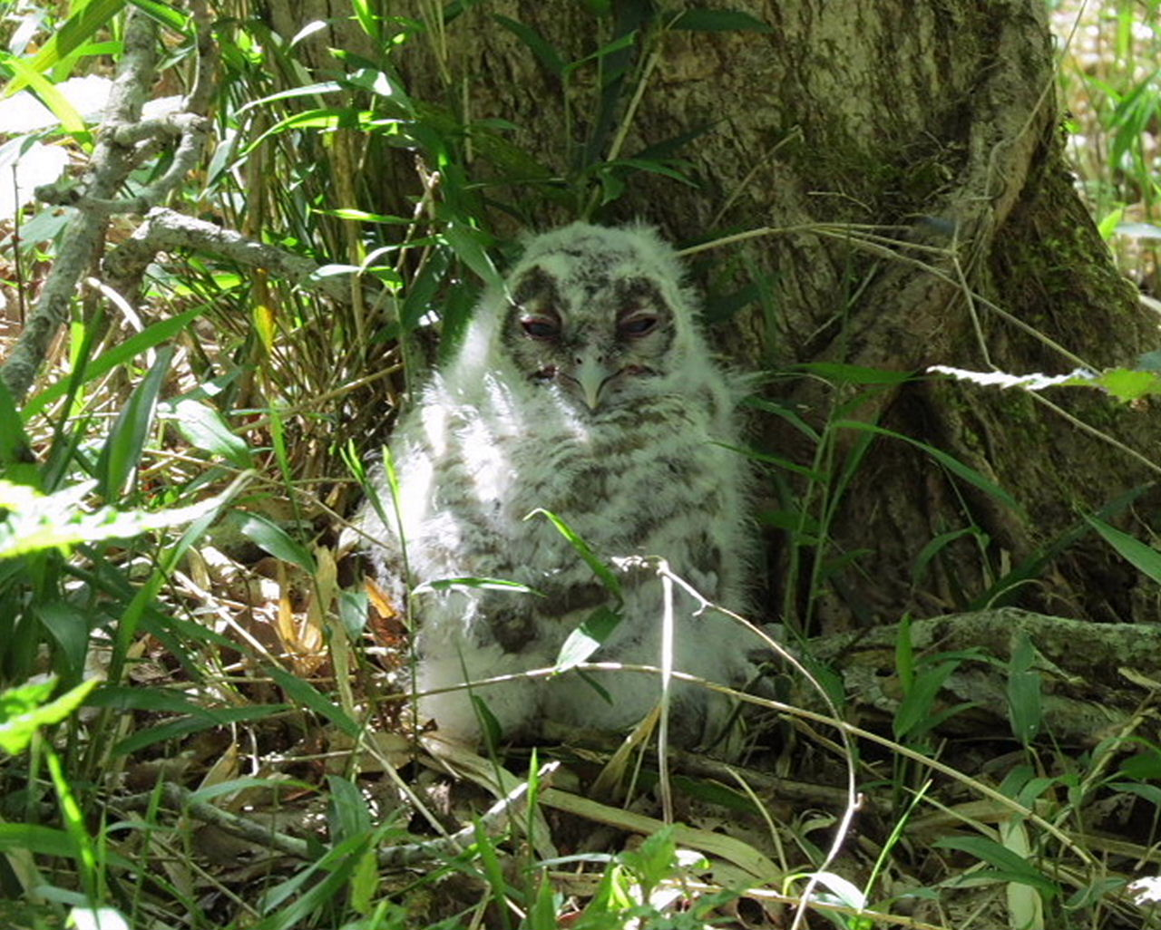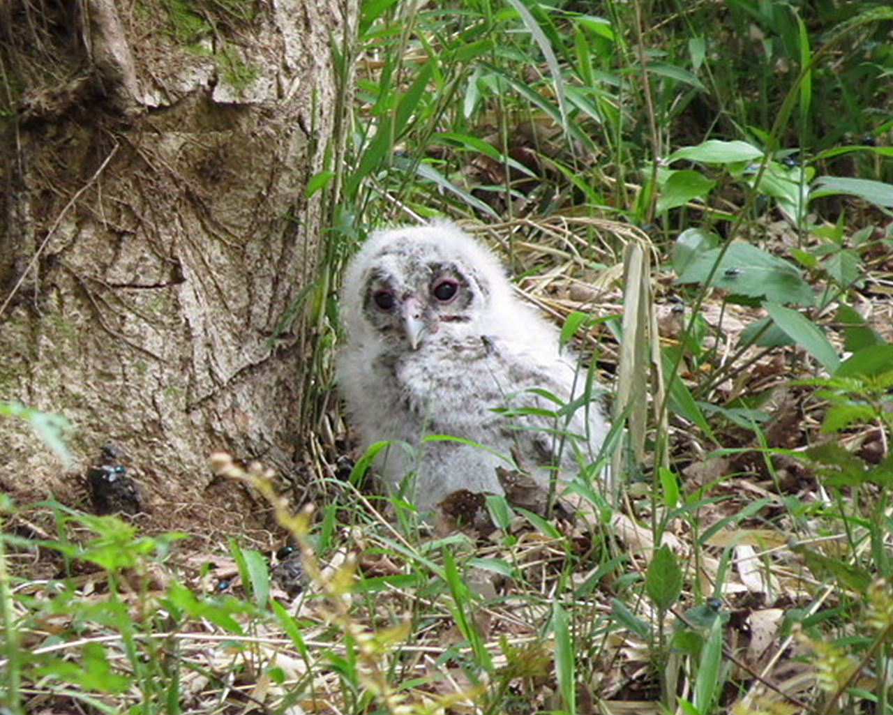 フクロウの雛は、時々、巣立ちする前に巣から落ちで地上で見られる事がありますが、親鳥が近くで見張っているので、雛に触ってはいけないそうです。