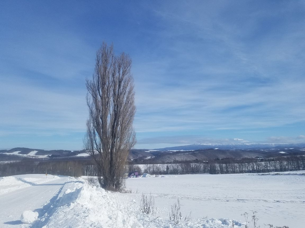 「ケンとメリーの木」は、美瑛の丘、パッチワークの道沿いにある大きなポプラの木です。適度なアップダウンの雪道、一面真っ白な丘のなかを進むと、立派な大きな一本の木が目に飛び込んできます。近くには駐車スペースがあり大型バスで乗り付けるインバウンドの方々も多かったです。確かに雪原の中に立つ姿は、存在感を感じました。界隈には、かつてのCMで有名になったポイントが複数ありますが、冬は通行できる道が限られているなか、ここは一番アクセスしやすいと思います。
