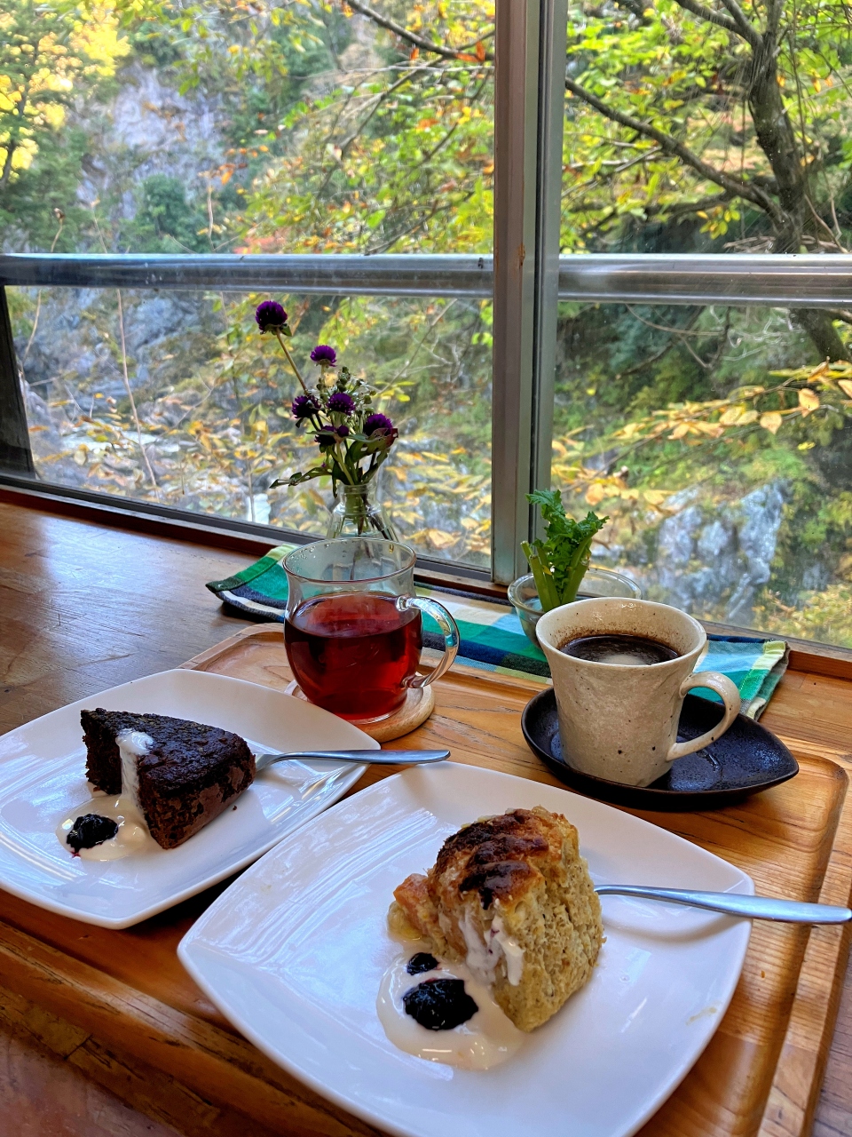 オーガニックカフェ『絶景カフェ ぽっぽ』は、鳩ノ巣小橋のたもとにあり、店主のお婆ちゃんがひとりで切り盛りしています。