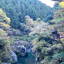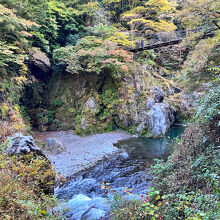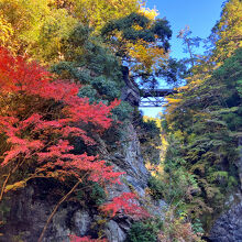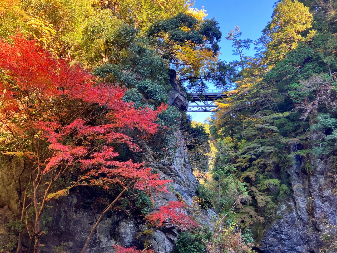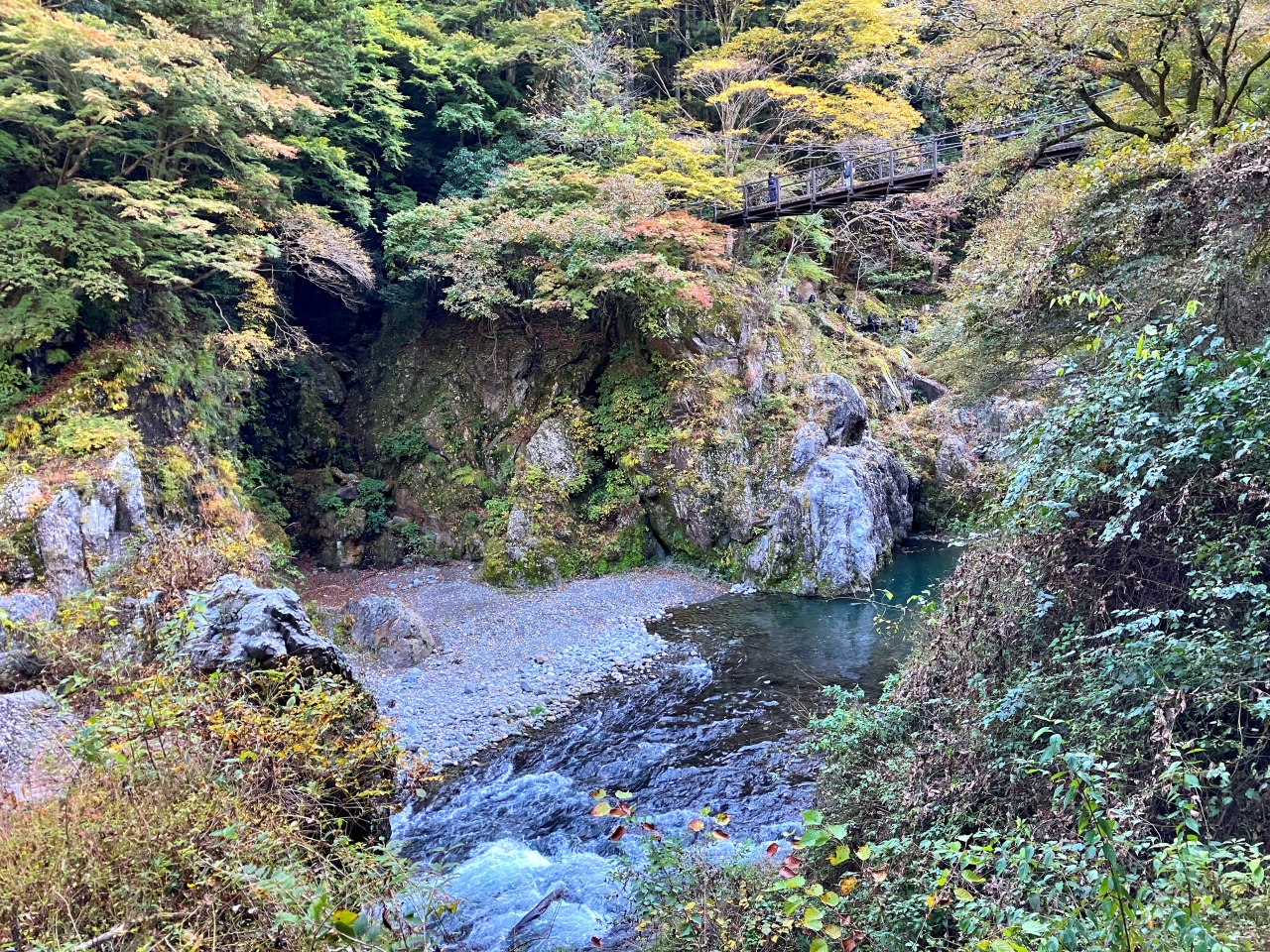 奇岩怪石の渓流と紅葉が織りなす「鳩ノ巣小橋(吊り橋)」からの眺望は一見の価値あり!