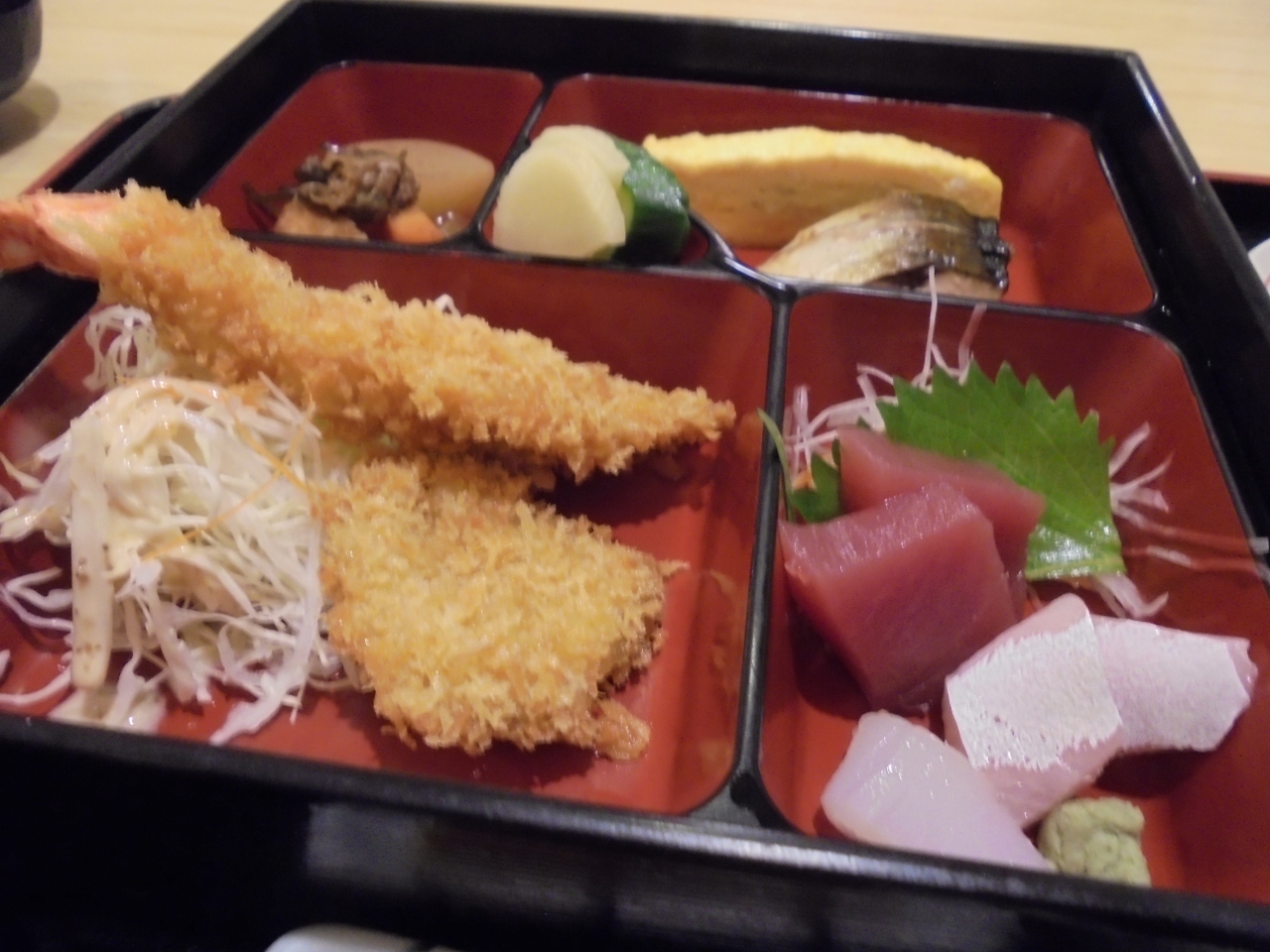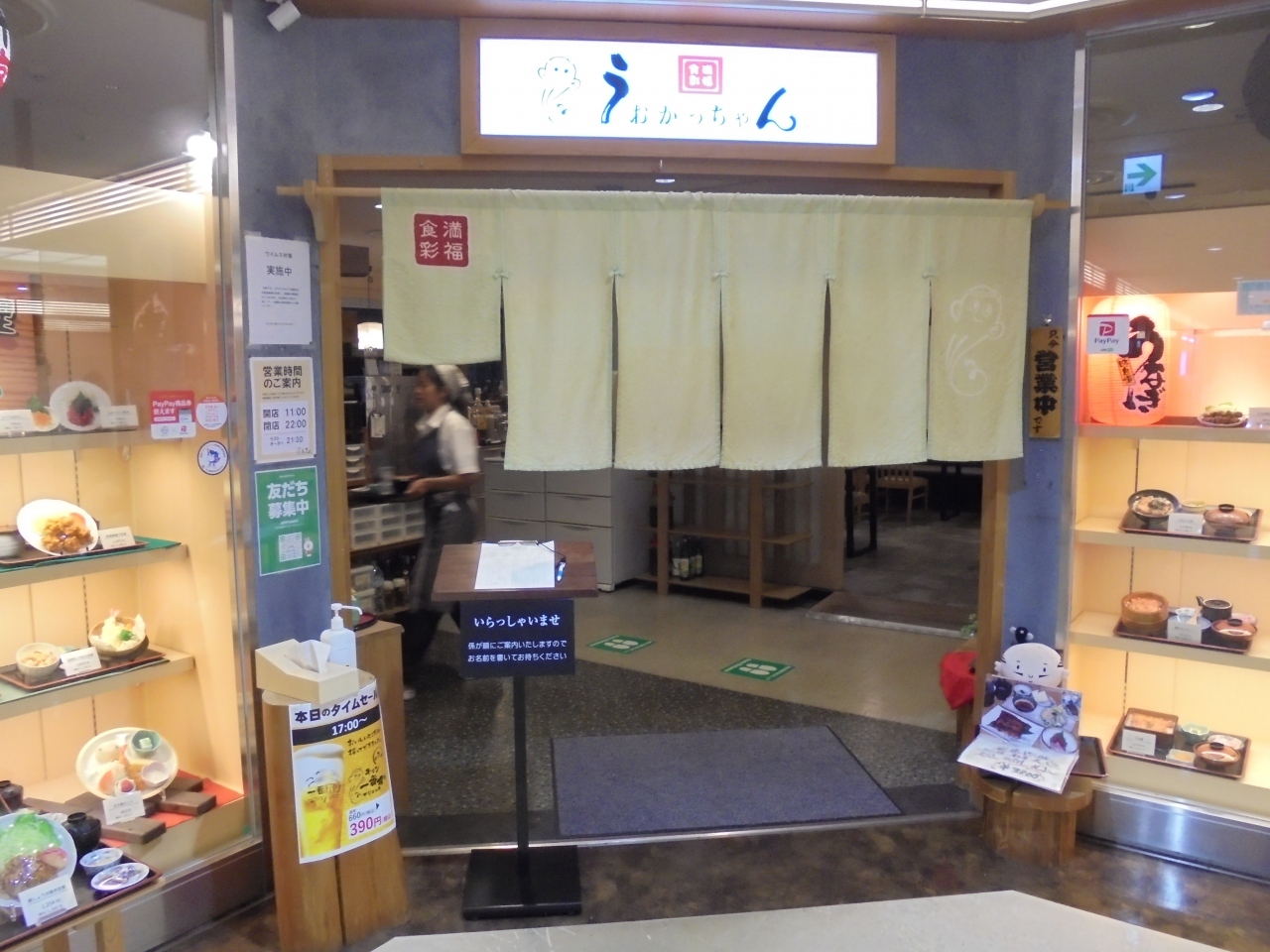 JR浜松駅MAYONE7階にあるレストランです。レジ後ろの壁には著名人の色紙がたくさん飾られている。人気あるお店のようだ。おひとりさまなのに6人がけテーブルへ。男性用の大きなスニーカーを履いたおばちゃんが明るく席に案内。落ち着ける和モダンな雰囲気だ。よくオーダーされるという、うおかっちゃん弁当と生ビール(税込\660が\390に)。頼んでラッキー!うまかっちゃん弁当は、エビフライ、魚フライ、焼き魚、ミニ刺身、などなど。彩り豊かなおかずがぎっしり。特に、フライものが美味しい。魚フライはひれかつと間違えるほど。味噌汁は赤だし風、名古屋の赤だしを彷彿とさせてくれる。浜松にまた来ることがあれば、ぜひ寄りたくなるお店だ。