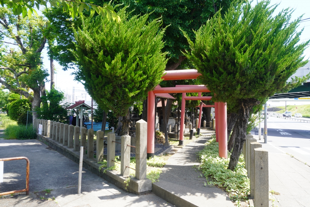 現龍大神は、長柄橋の北詰。柴島浄水場の敷地に接した小さな一角にありました。赤い三つの鳥居の先に祠があって、傍らには「現龍大神」と大書した大きな石碑。名前からして水の神様でしょうし、ここは浄水場。水の神様を祀るにはちょうどいい場所なんだと思います。
